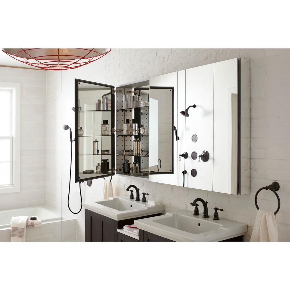 The Catalan medicine cabinet provides a stylish complement to any bathroom. Mirrors are positioned on the front and back of the door as well as the interior back wall of the cabinet. Four adjustable, black-tinted glass shelves hold your toiletries and bath items. Durable aluminum construction makes this cabinet rust- and rot-resistant.