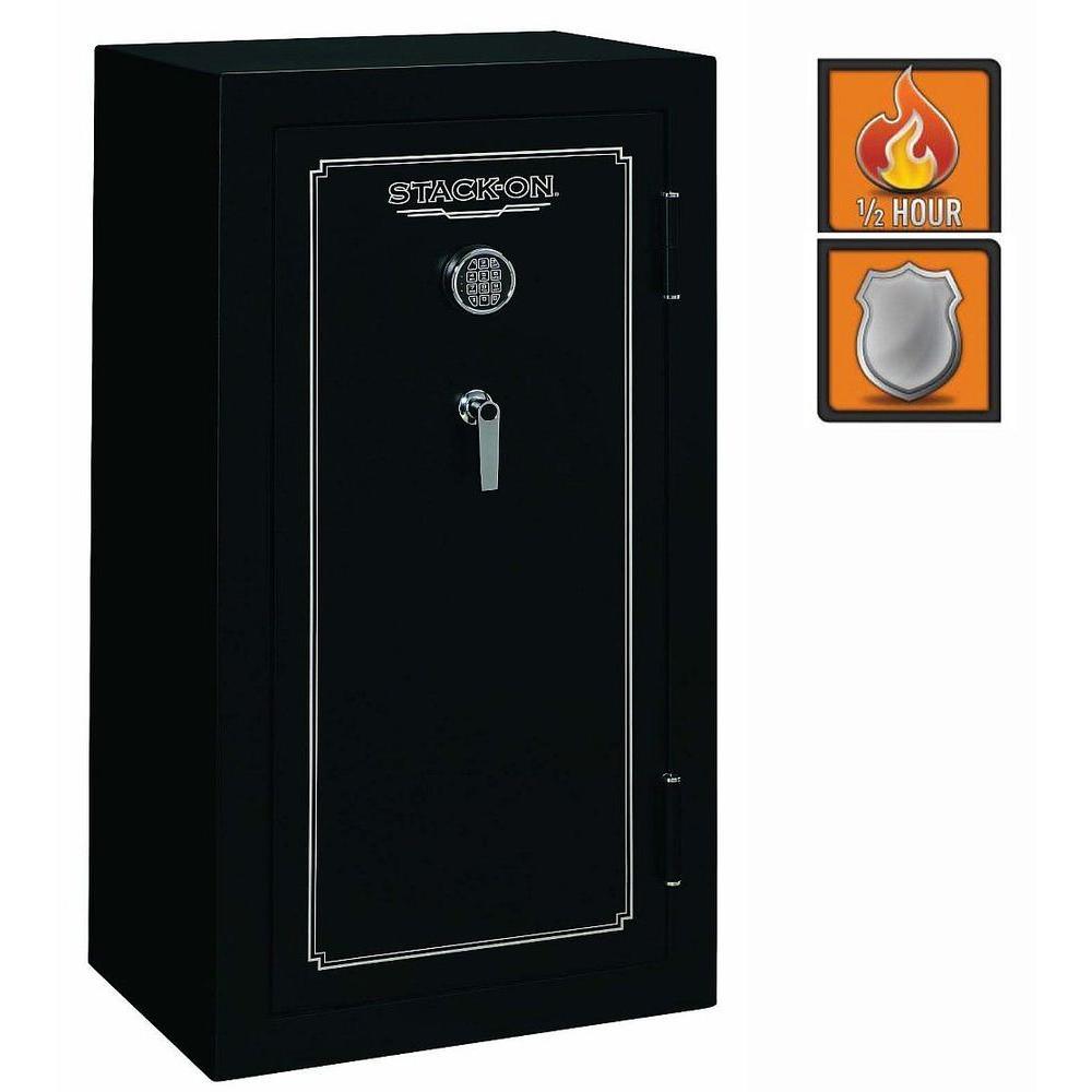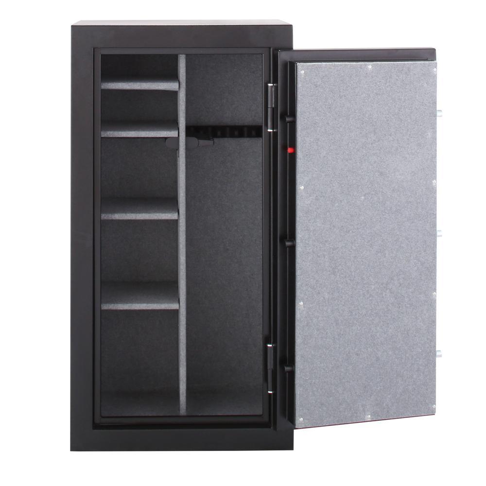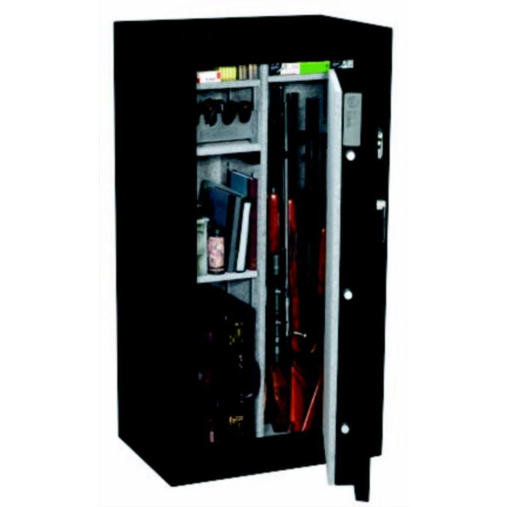24-Gun Fire Rated Safe with Electronic Lock. This safe is Fire resistant up to 1400 for 30 minutes to protect important papers and other valuables and has a fully convertible interior that can convert from all guns to all shelves. The exterior has a matte black finish with chrome accents.