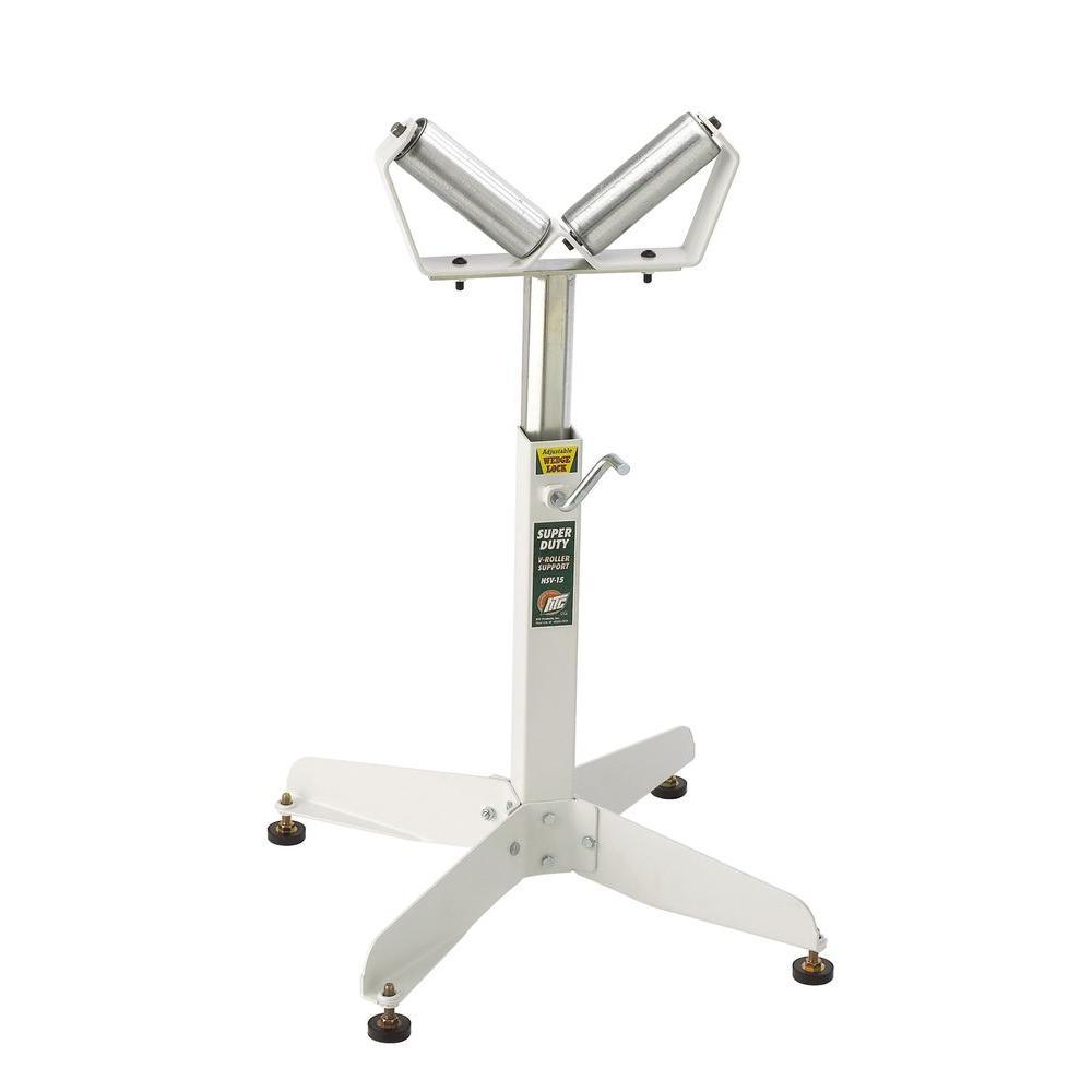 These super duty, V-shaped supports are designed to capture round or unusually shaped items which require infeed/outfeed and rotational support. HSV-15 features a fixed position, heavy-duty 6 in. rollers. The stands are height adjustable, with Wedge-lock design, 4 non-skid leveling feet and a 500 lbs. capacity.