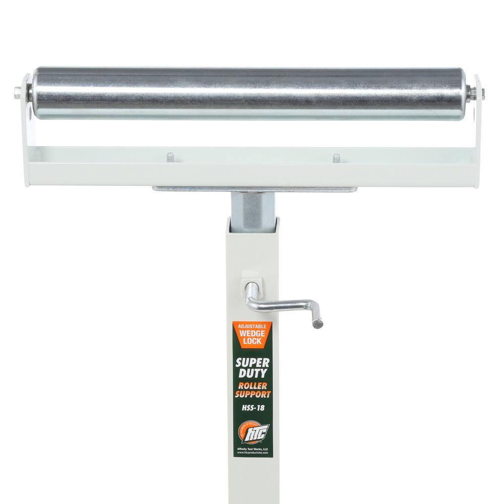 The HSS18 Super Duty Roller Support is designed for industrial and production applications. Features dual-position galvanized steel rollers, heavy-duty 7/16 in. hex roller axles, 4 rubber tipped leveling feet and 500 lb. capacity and exclusive Wedge-lock design. HSS18 is ideal for planers, horizontal band saws and other low machines.