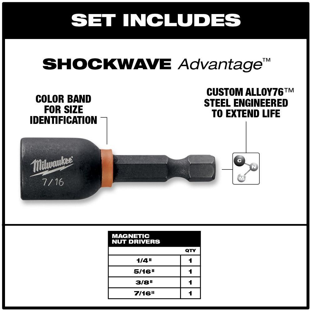The 4PC MILWAUKEE® SHOCKWAVE™ Impact Duty™ 1-7/8 Magnetic Nut Drivers are engineered for extreme durability and up to 30x life. The Milwaukee nut drivers are made from a proprietary steel, heat treated to control hardness and feature a strong magnetic tip for a secure grip and unyielding bit engagement. Each magnetic nut driver bit has a color coded ring for quick and easy identification on the jobsite. The SHOCKWAVE™ Impact Duty™ accessory line is designed for use with impact drivers and drill drivers and ideal for heavy-duty impact applications, while delivering a full system solution for all the user's drilling and fastening needs.