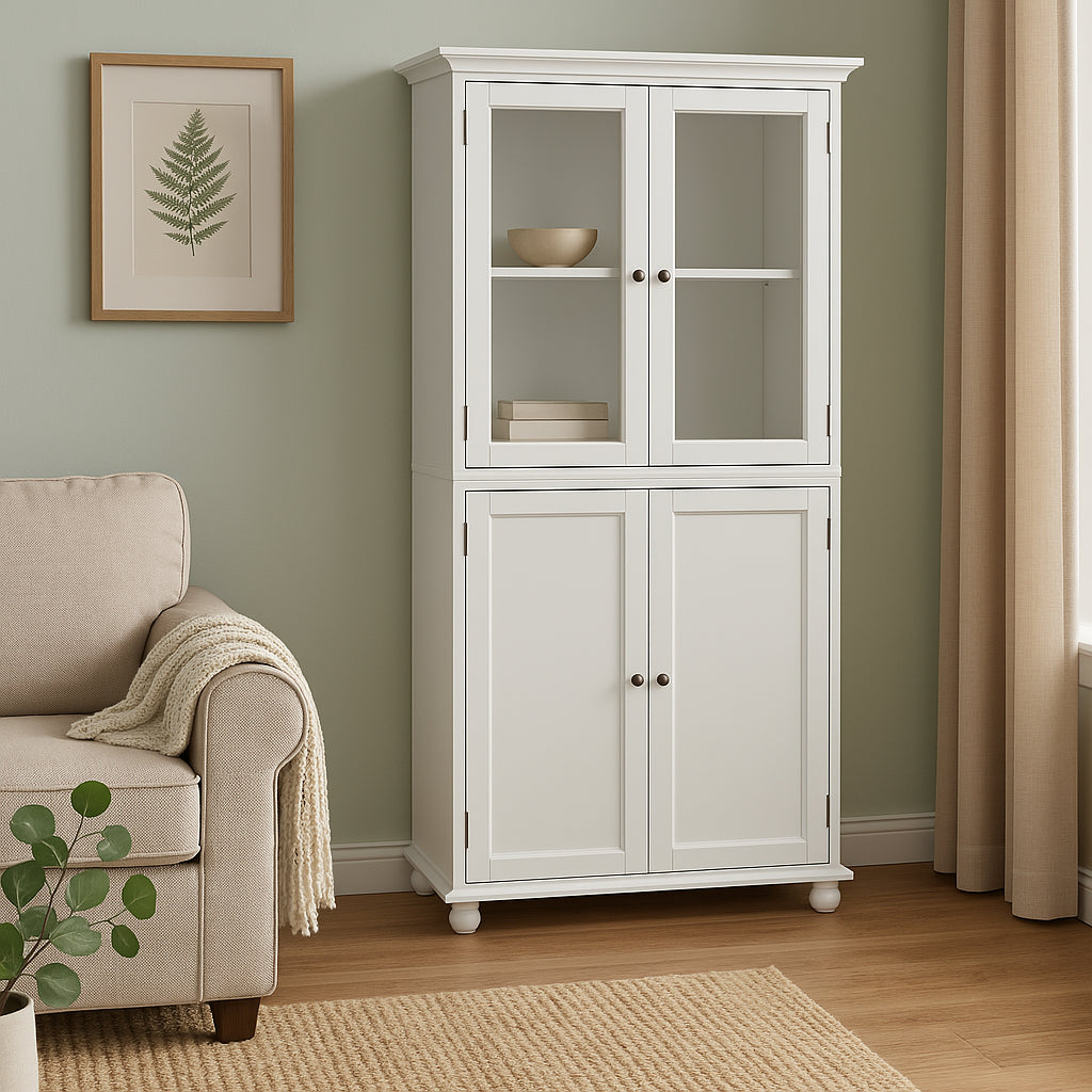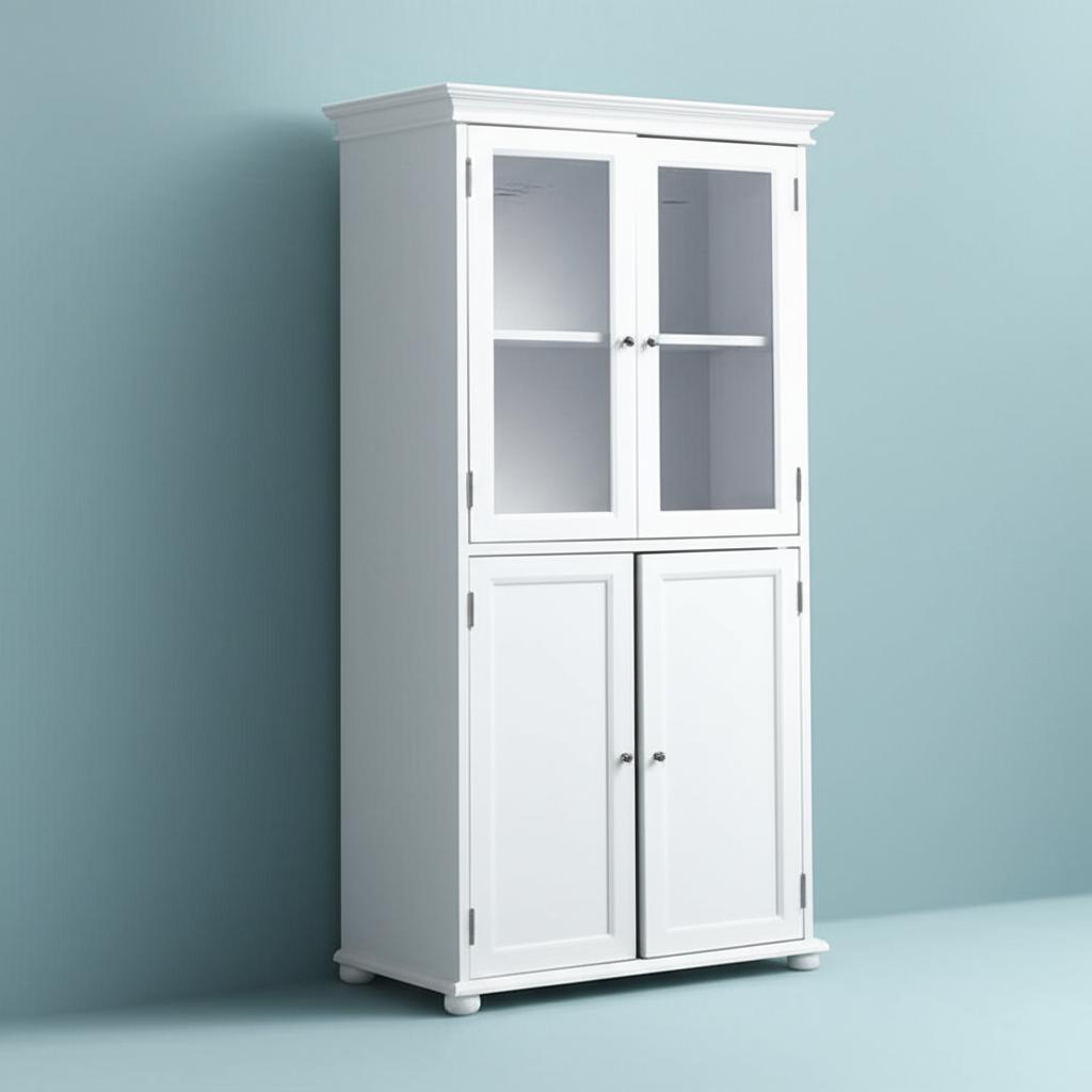 The Hampton Harbor Linen Cabinet combines elegant design with practical storage. Featuring a glossy white finish, crown molding, and bun feet, it offers ample space with adjustable shelves and glass-paneled doors. Perfect for any room, this cabinet is both stylish and functional.