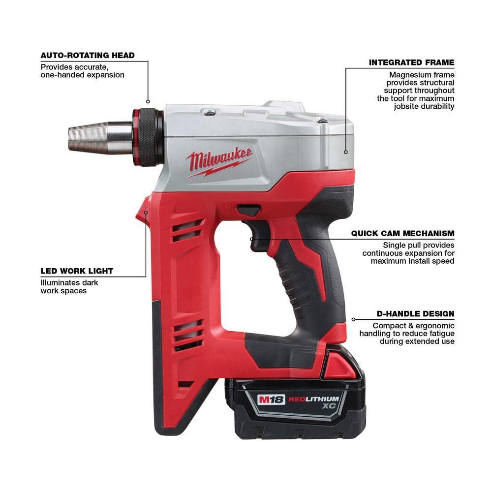 The M18 Cordless lithium-ion ProPEX Expansion Tool features an auto-rotating head for convenient 1-handed operation. A D-handle design and integrated magnesium frame offers maximum jobsite durability, while the quick cam mechanism delivers precise, continuous expansion for 3/8 in. to 1-1/2 in. ProPEX connections. Designed specifically for Uponor ProPEX, the M18 ProPEX Expansion tool is built to make effortless installations faster than other tools available.