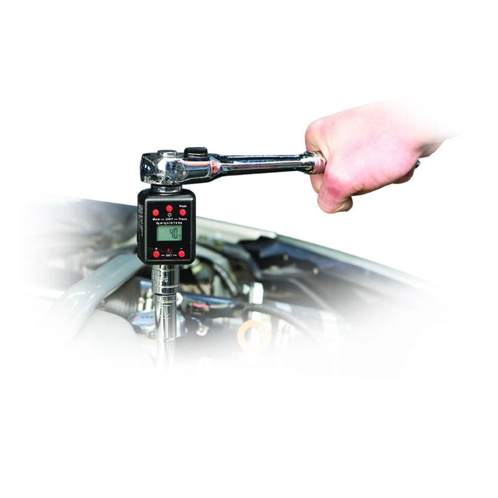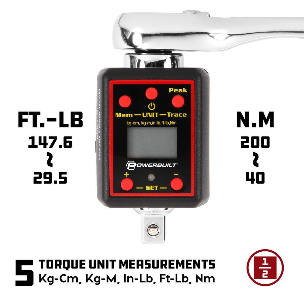 The Powerbuilt 1/2 in. drive Digital Torque Adapter converts any standard 1/2 in. drive ratchet into an accurate digital torque wrench. Simply set the desired torque value, plug in a ratchet and socket and tighten the fastener until the digital display and audible tone indicate you've reached your target torque. You can also use it to calibrate an existing torque wrench right in your own shop or garage. Display modes include Peak, which displays and stores the max torque applied and Trace, which shows real-time torque as it is applied. Selectable for five torque units of measure: lbs. ft., lbs. in., kg-cm, kg-m and N-m.