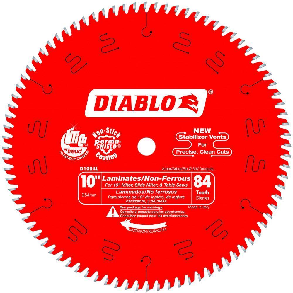 Diablo's next generation 12 in. x 96 Tooth Non-Ferrous Carbide Circular Saw Blade features new laser-cut stabilizer vents for precise and clean cuts in laminates and non-ferrous materials. The advanced stabilizer vents feature a permanent filler baked in from top to bottom for absorbing noise and preventing sideways movement, allowing the blade to slice through laminates and non-ferrous metals cleanly, quickly and accurately. Constructed with TiCo Hi-Density special-blend carbide, Diablo's 12 in. non-ferrous blade produces precise cuts and provides 5X longer cutting life. The laser cut heat expansion slots allow the blade to expand and contract during use, keeping the cut true and straight. This blade is excellent for cutting laminate flooring, plastics, brass, aluminum, copper and fiberglass.