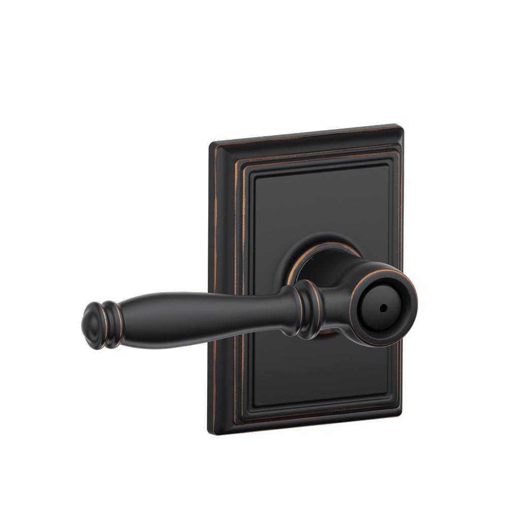 The Schlage Birmingham Aged Bronze Privacy Door Knob with Addison Trim is perfect for interior doors where locking is needed, such as bedroom and bathroom doors. The Birmingham door knob features a distinctive style that harkens back to the Colonial era, while the Addison trim features a traditional design inspired by the understated elegance of classic New England architecture. The universal design of this privacy door knob set allows it to be mounted to left or right swing doors. Plus, it's been designed and tested with strength and durability in mind.