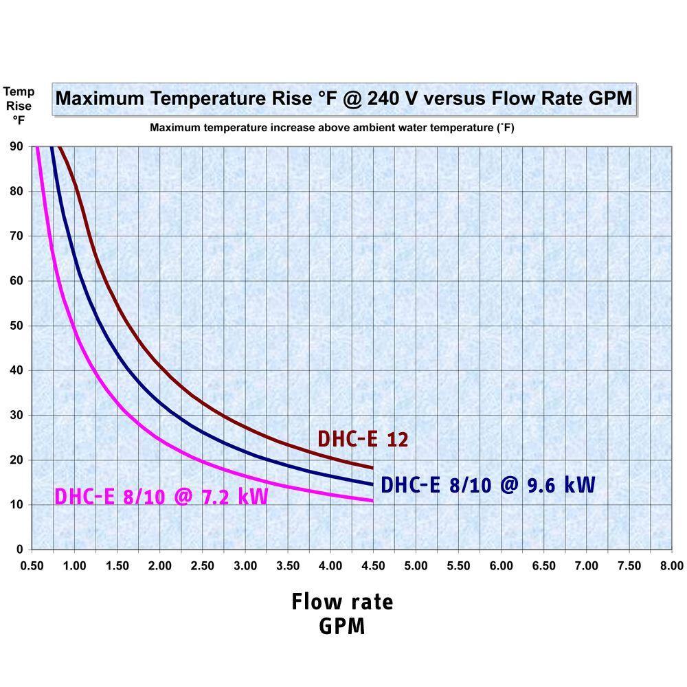 - DHC-E 8/10 units installed at 9.6 kW will give these flow rates: 1.87 GPM at 35°F, 1.46 GPM at 45°F, 0.85 GPM at 77°F; and 1.41 GPM at 35°F, 1.09 GPM at 45°F, 0.64 GPM at 77°F if installed at 7.2 kW