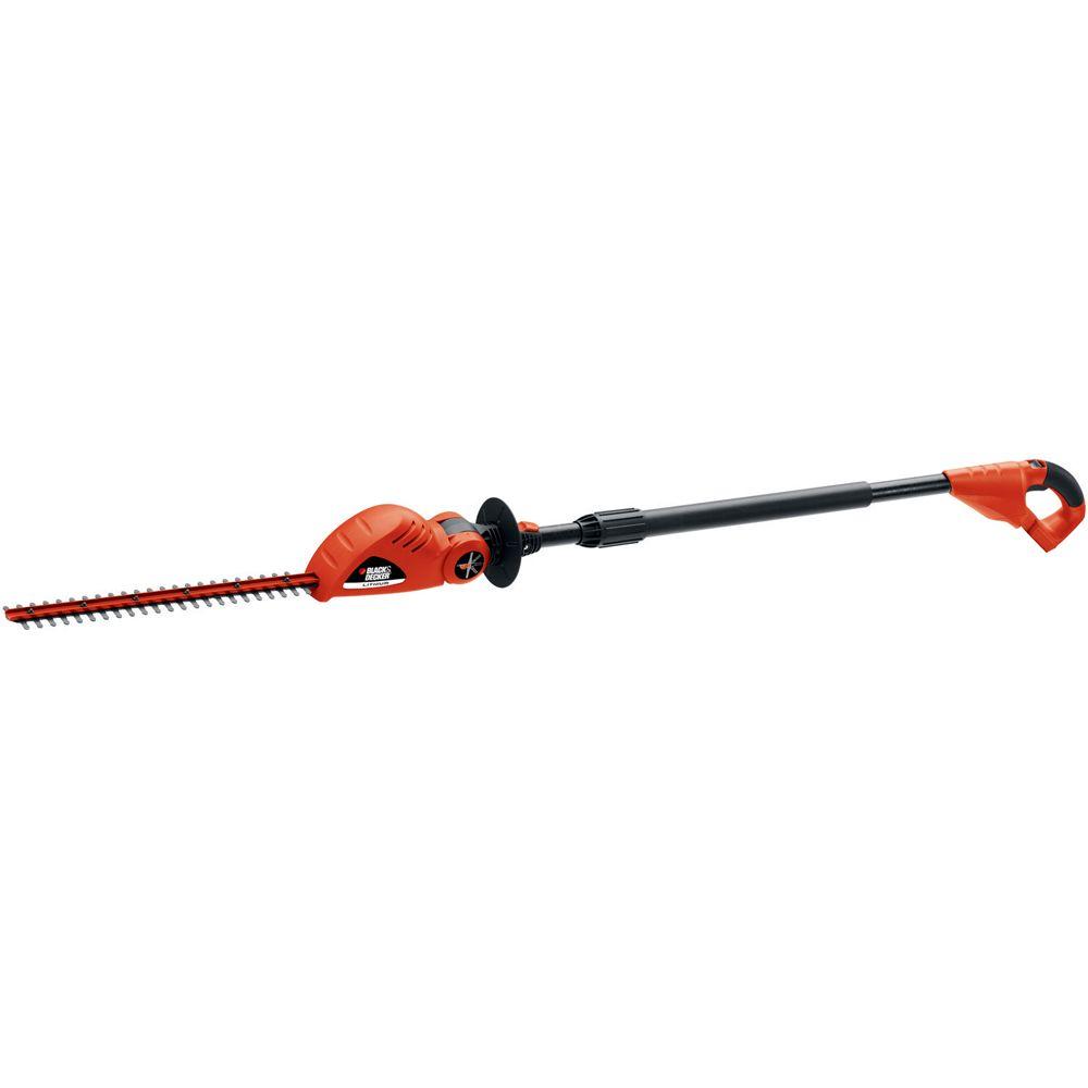 The BLACK+DECKER LPHT120 22 in. 20-Volt Lithium-ion cordless pole hedge trimmer is perfect for those difficult, hard to reach hedges. The pole hedge trimmer has 180° pivoting head that adjusts and locks into five different positions for cutting high hedges. The LPHT120 has 18 in. dual action cutting blades with a 7/16 in. cut capacity. This unit is easy to store and only weighs about 7 lbs.