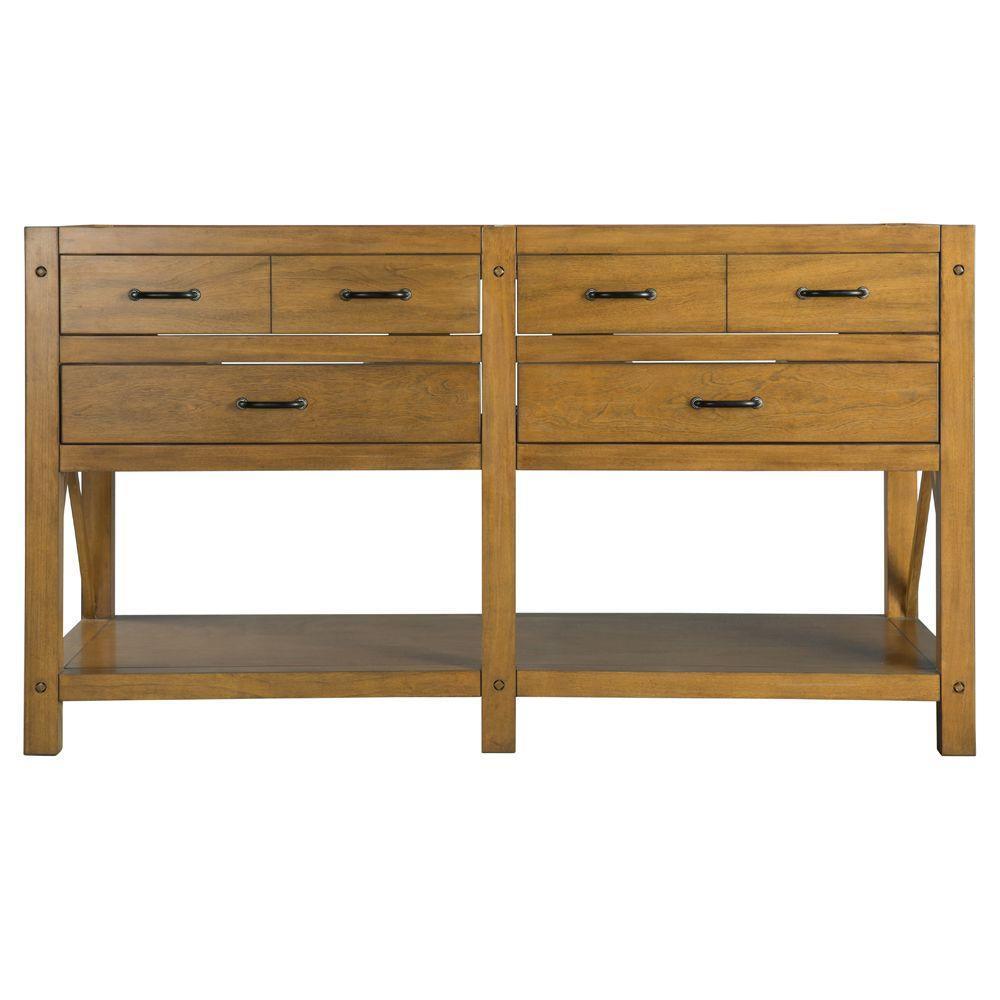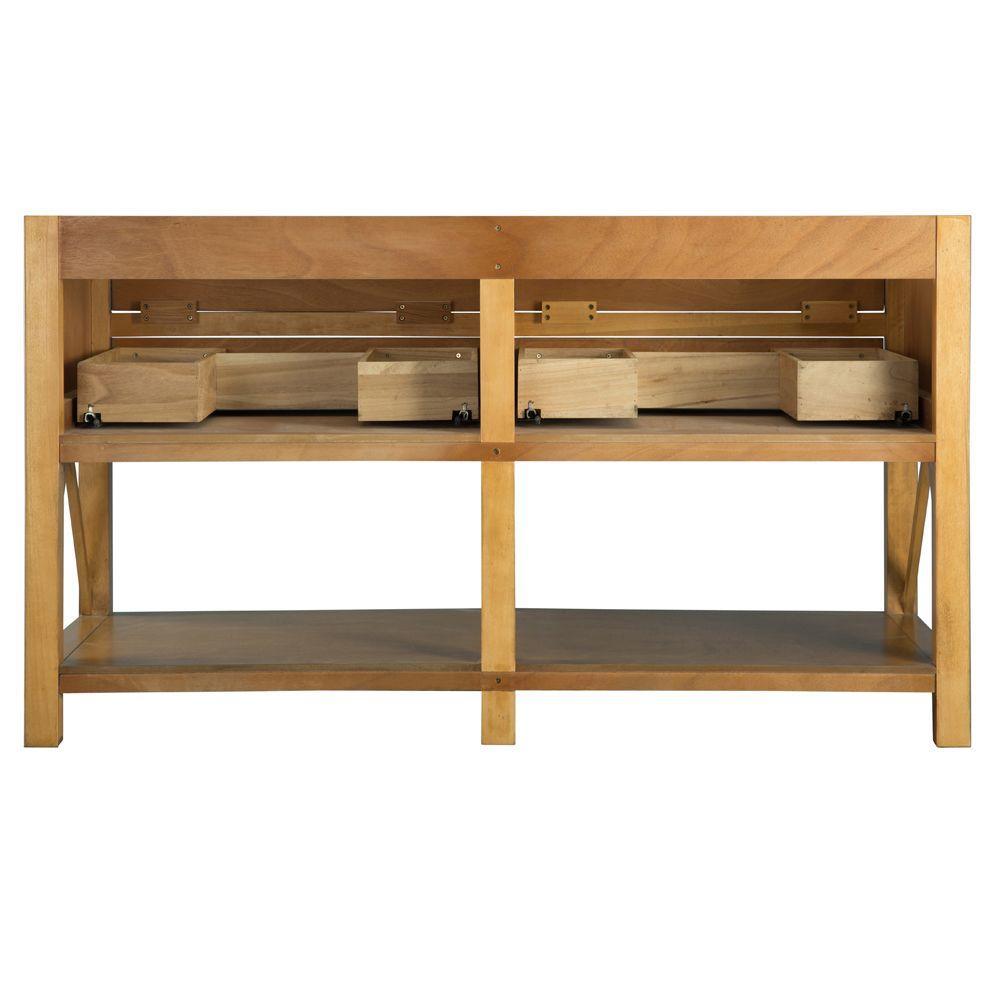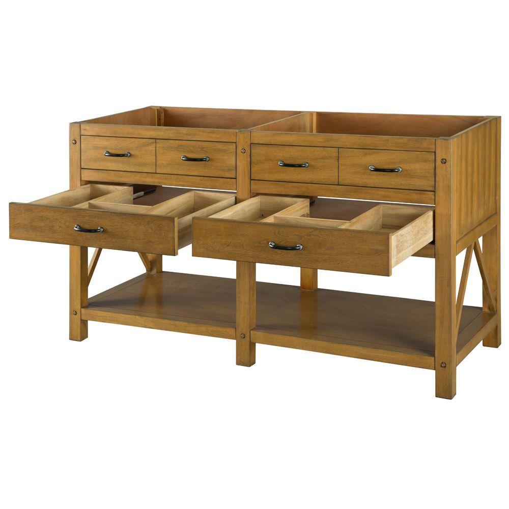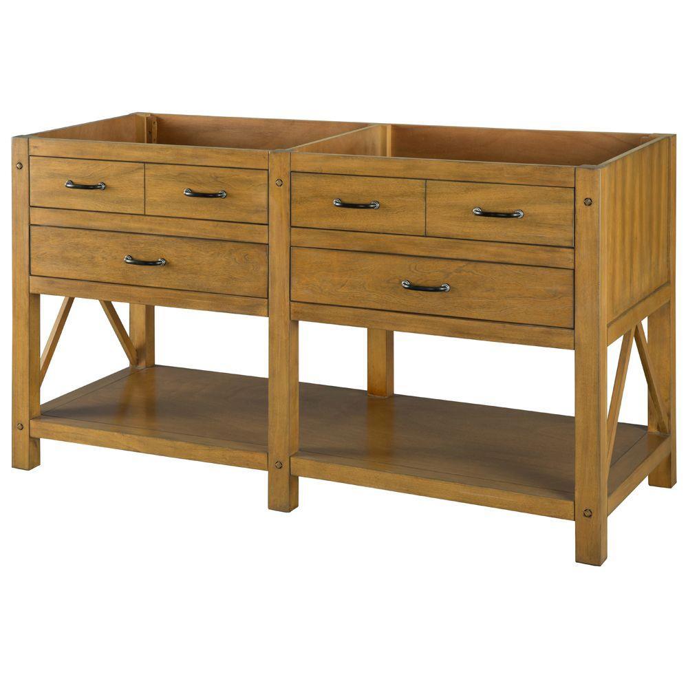 Bring the aura of a rustic retreat into your everyday home with this 60 in. double vanity in pine. The natural aesthetic of distressed wood will breathe a sense of calmness into any bathroom, while the console-style open-bottom design gives the room a spacious, airy feel. Two lower drawers have built-in compartments to keep powder room essentials orderly and the lower shelf can be utilized for bath linens, decorative items or a place for guests to stash travel bags and toiletries. This vanity from the Foremost Avondale collection is durably constructed with the rigidity that makes homeowners think it is custom-built, at the same time emitting a relaxing vibe that bespeaks its cottage-style charm.