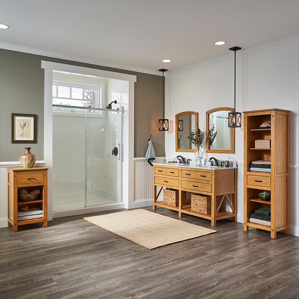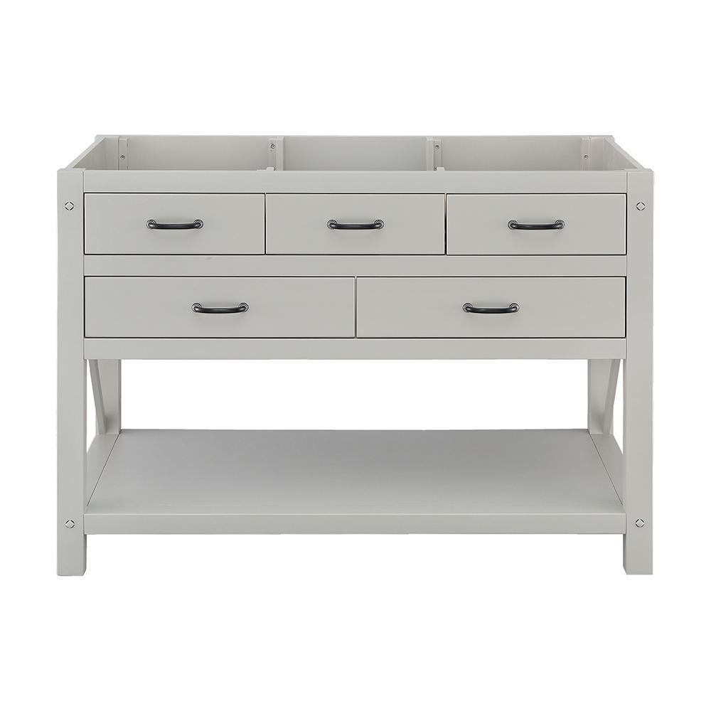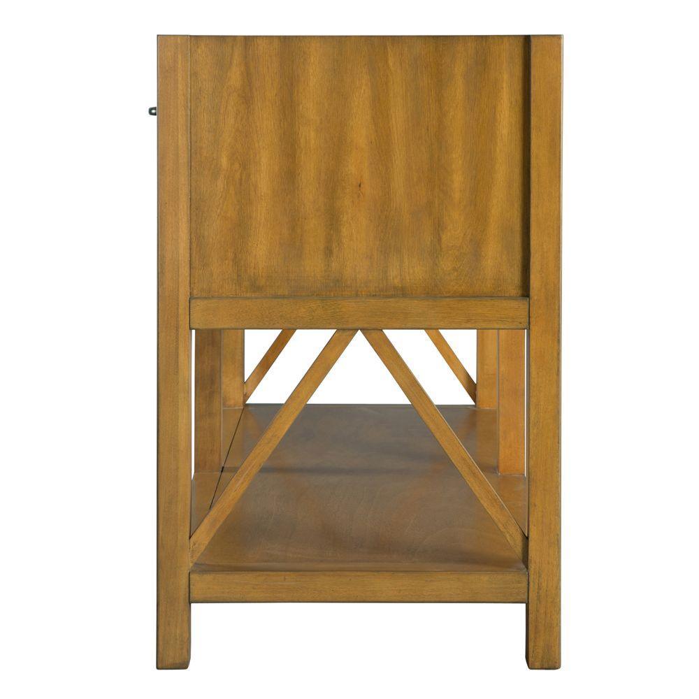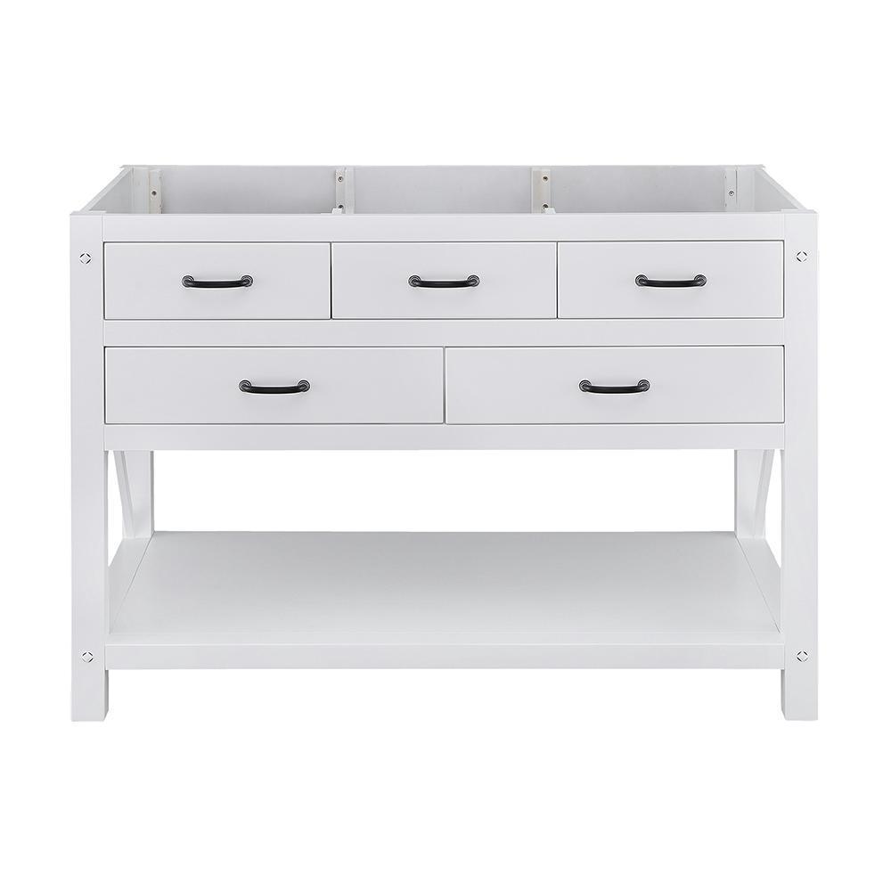 Bring the aura of a rustic retreat into your everyday home with this 60 in. double vanity in pine. The natural aesthetic of distressed wood will breathe a sense of calmness into any bathroom, while the console-style open-bottom design gives the room a spacious, airy feel. Two lower drawers have built-in compartments to keep powder room essentials orderly and the lower shelf can be utilized for bath linens, decorative items or a place for guests to stash travel bags and toiletries. This vanity from the Foremost Avondale collection is durably constructed with the rigidity that makes homeowners think it is custom-built, at the same time emitting a relaxing vibe that bespeaks its cottage-style charm.
