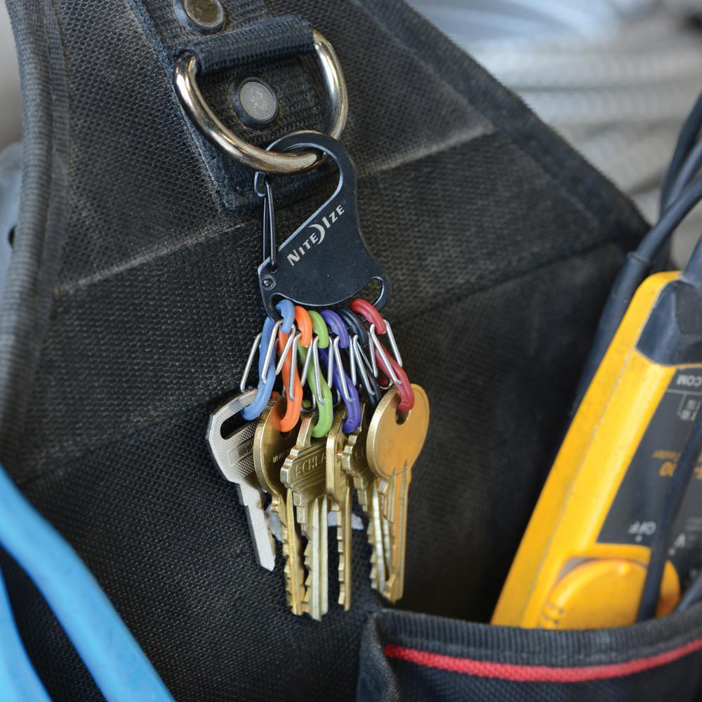 The Nite Ize Key Rack is as functional as it is compact, versatile as it is simple and useful as it is (for lack of a better word) cool-looking. Its high quality stainless steel carabineer clip has a secure gate closure on one end, allowing you to clip your keys to an existing key ring, belt loop, purse strap, zipper pull anything with a loop or D-ring. The other end holds six different-colored plastic S-Binders, perfectly sized to hold 6 separate keys. Identify your keys by color and attach and release them individually from the Key Rack with ease. No more fiddling with split rings or fumbling to find the key you need the Key Rack is perfect for quick and easy sharing of keys with family members, leaving a key for a valet or babysitter and taking a single key when you're out on a run or ride.