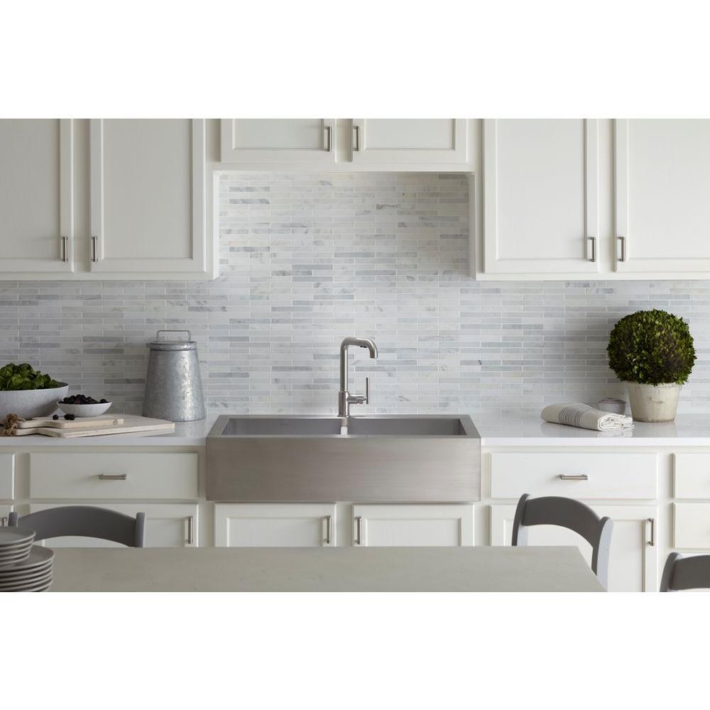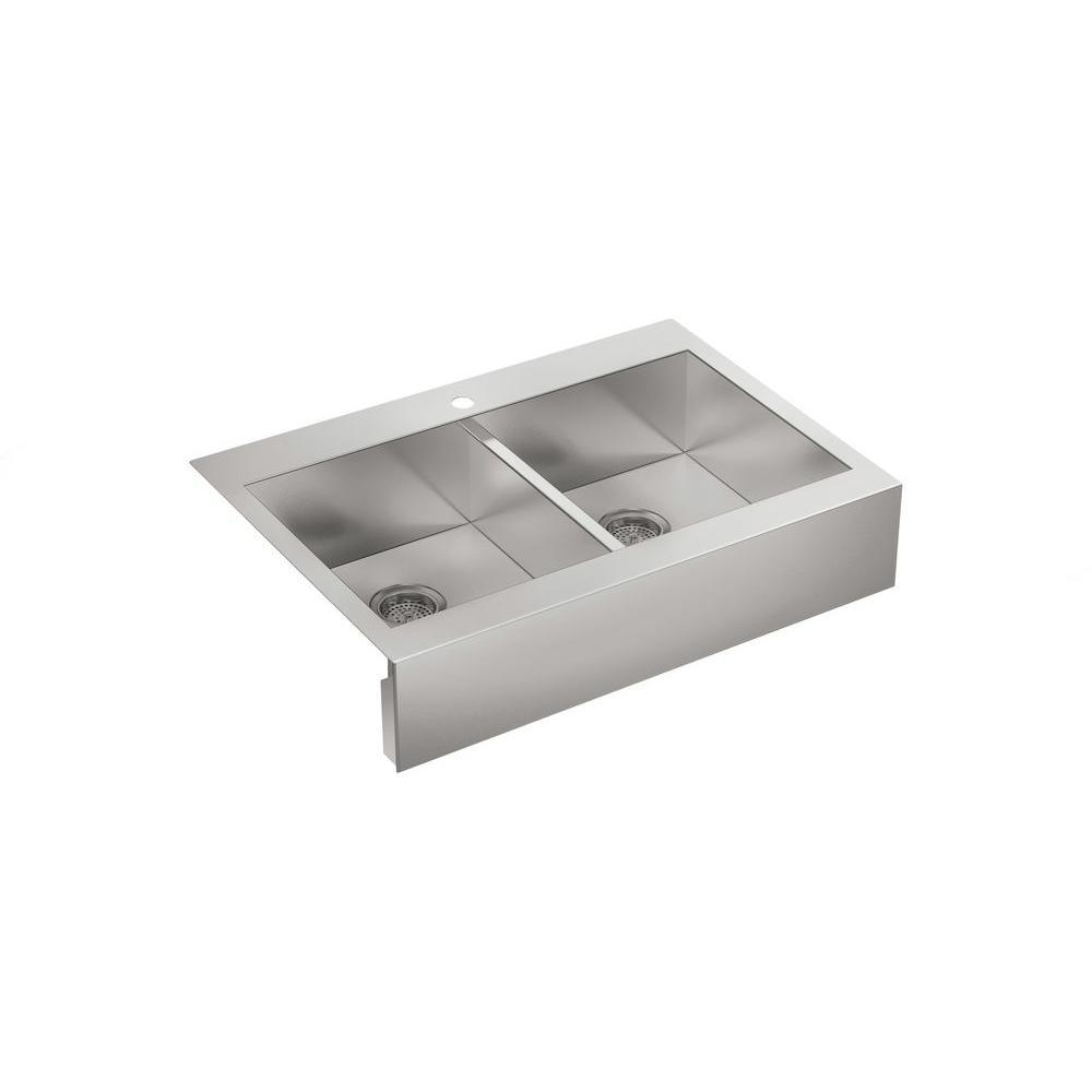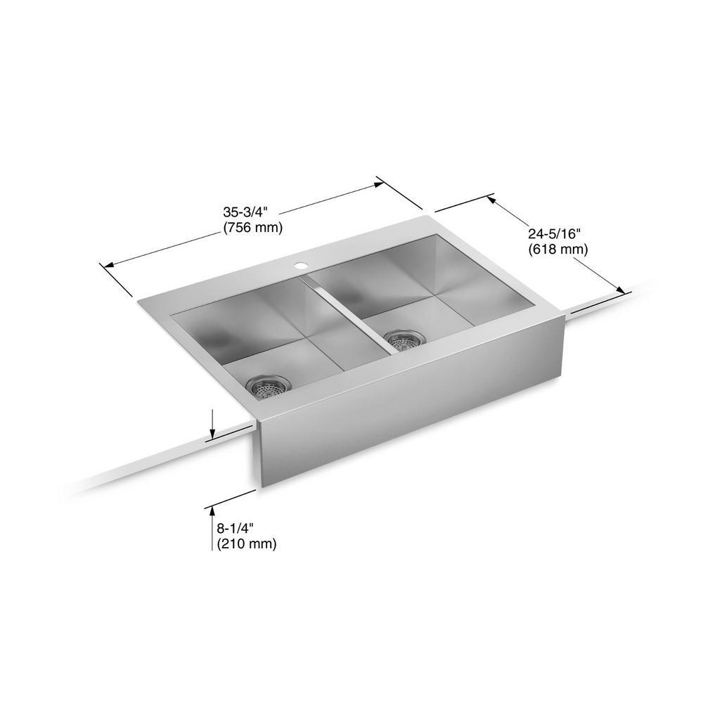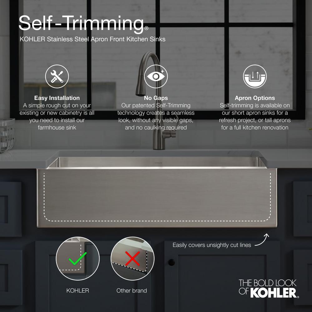 If you want the look of an apron-front sink, but don't want to replace your cabinets and countertop, you'll love the Vault. This top-mount apron-front sink features a thin, 1.25 mm rim and an innovative shortened, Self-Trimming apron, allowing for installation in most existing standard cabinets and laminate countertops. Unlike most farmhouse sinks, the Vault apron-front sink doesn't require a special apron-front cabinet, making it ideal for replacement or remodel situations and enabling a fresh look with minimal time and expense. The installation requires only the removal of the cabinet's false drawer front and a simple cut to the cabinet face. The unique Self-Trimming apron overlaps the cabinet face, ensuring consistently beautiful installation results. Simply be sure to use the Pre-Installation Sink, Counter and Cabinet Compatibility Template to ensure the sink will fit in your kitchen setup. It comes included with the sink or can be ordered ahead by calling 1-800-4KOHLER.