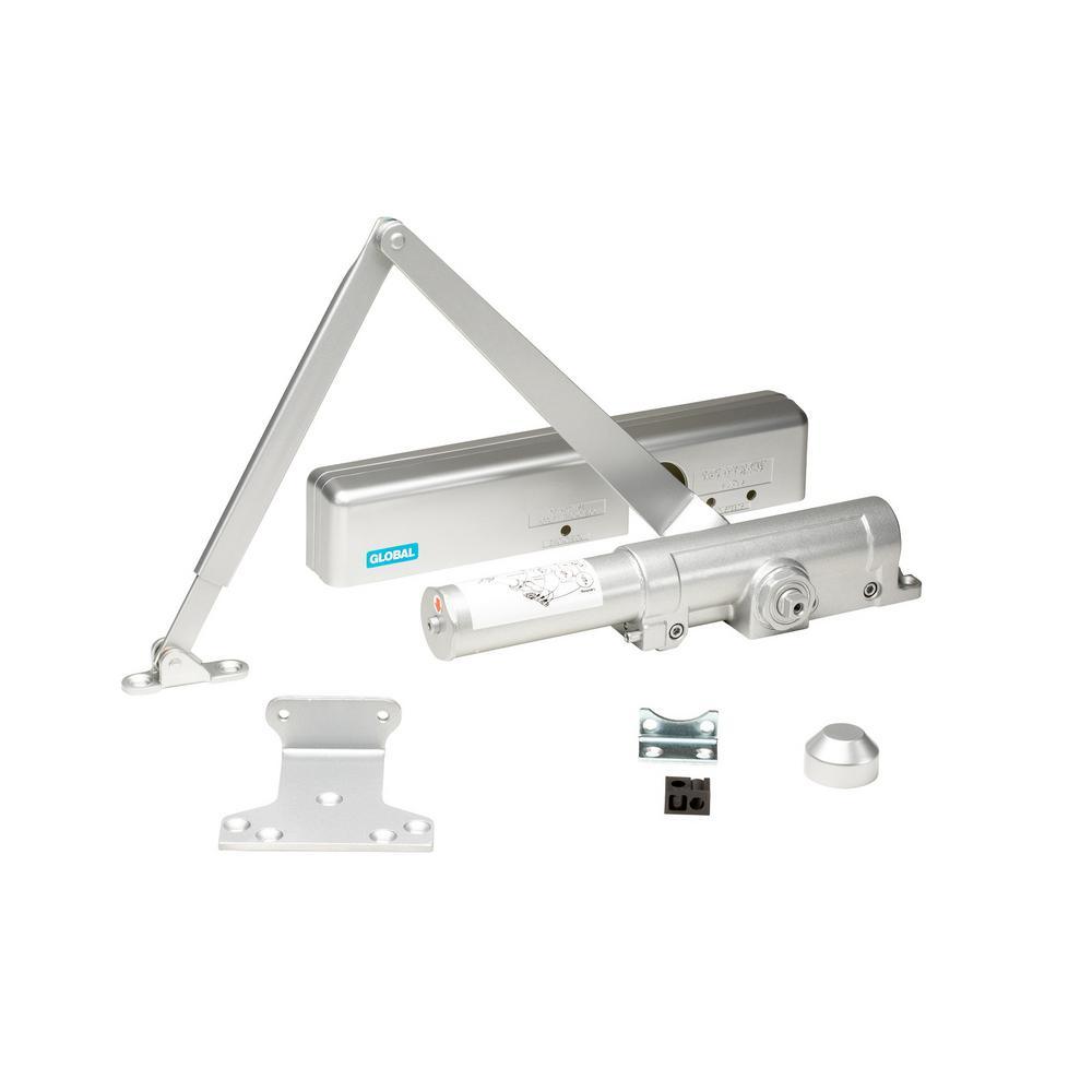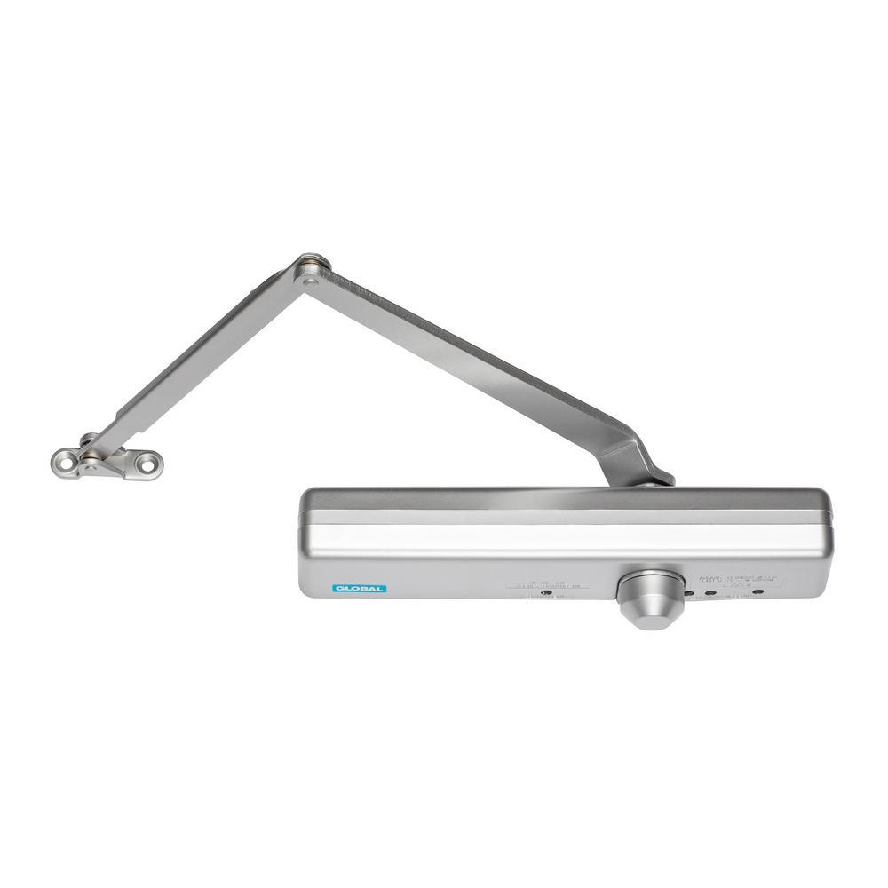The Global Door Controls Slim-Line, heavy duty, commercial door closer comes in an aluminum finish and with an adjustable spring tension size from one to six. The closer is a slim line model ideal for institutional and high traffic applications. It is fully compliant with opening force requirements for ADA and ANSI/BHMA standards and fits doors weighing up to 258 lbs.