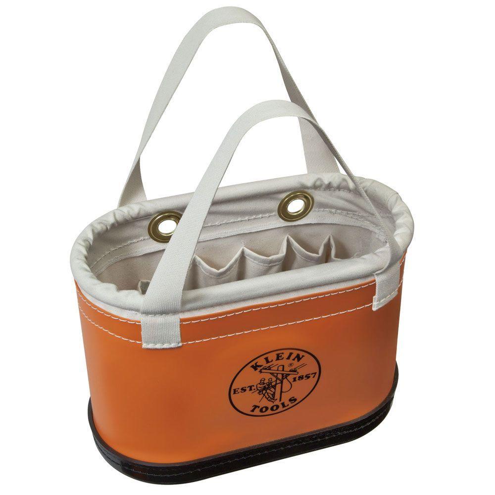 This all-purpose work bucket transfers your tools safely and securely. Orange, non-conductive palstic exterior maintains bucketsshape. This lineman bucket features 15 interior pockets to keep your tools organized and secure.