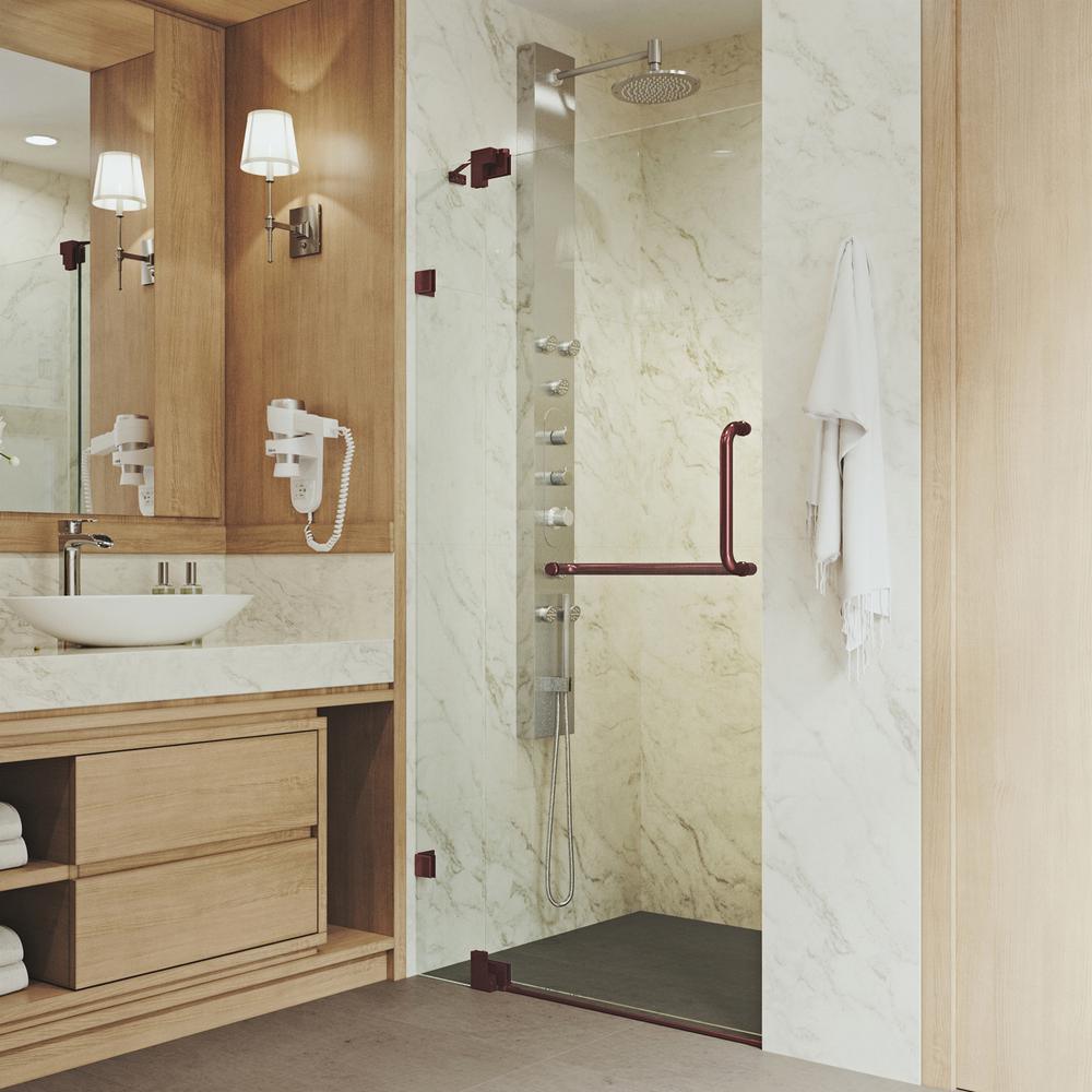 The unique pivoting door system on the VIGO Pirouette Frameless Pivot Shower Door is a safe and effective way to update your modern bathroom. Made from the highest quality 304-series stainless steel and durable tempered glass, this shower door features a sleek door handle and matching towel bar for added convenience. To your preference, this door can be installed to open from the left or right side. The towel bar and door handle are also reversible so you can customize your shower door even further. This shower door fits opening widths between 30 to 36 in.