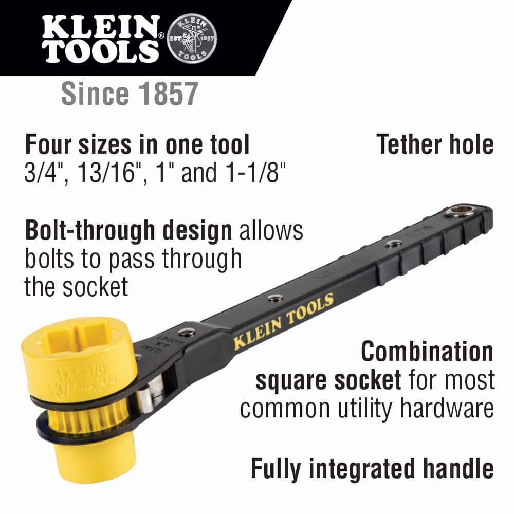 The highly versatile Klein Tools' Ratcheting Lineman's Wrench is perfect for utility work. Its innovative 4-in-1 design includes 3/4-Inch, 13/16-Inch, 1-Inch, and 1-1/8-Inch combination square sockets, making it compatible with the most commonly used utility hardware. With a bolt-through design, bolts can easily pass through the socket. The wrench also features a tether hole for secure working at heights. Additionally, the fully integrated handle provides durability and a non-slip grip for added comfort. Its small gear teeth allow for shorter throws, making it ideal for use in tight spaces. The bright yellow socket ensures easy visibility on the job.