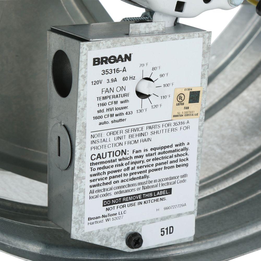 Trapped attic air can easily reach 150 degree or more. The BROAN 35316 gable mounted attic ventilator will remove super-heated attic air, making any home more comfortable, whether it's air conditioned or not. In those homes that are, the air conditioners will run less and won't have to work nearly as hard. And this powered attic ventilator is as efficient as it is dependable. An adjustable built-in thermostat operates automatically giving a quiet, high performance operation for inside-the-attic application. Combine with the specially designed 433 Automatic Shutter to get optimum efficiency and performance.