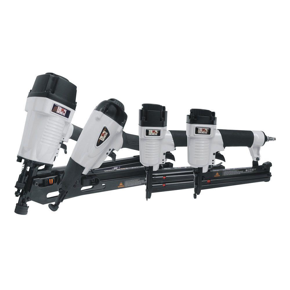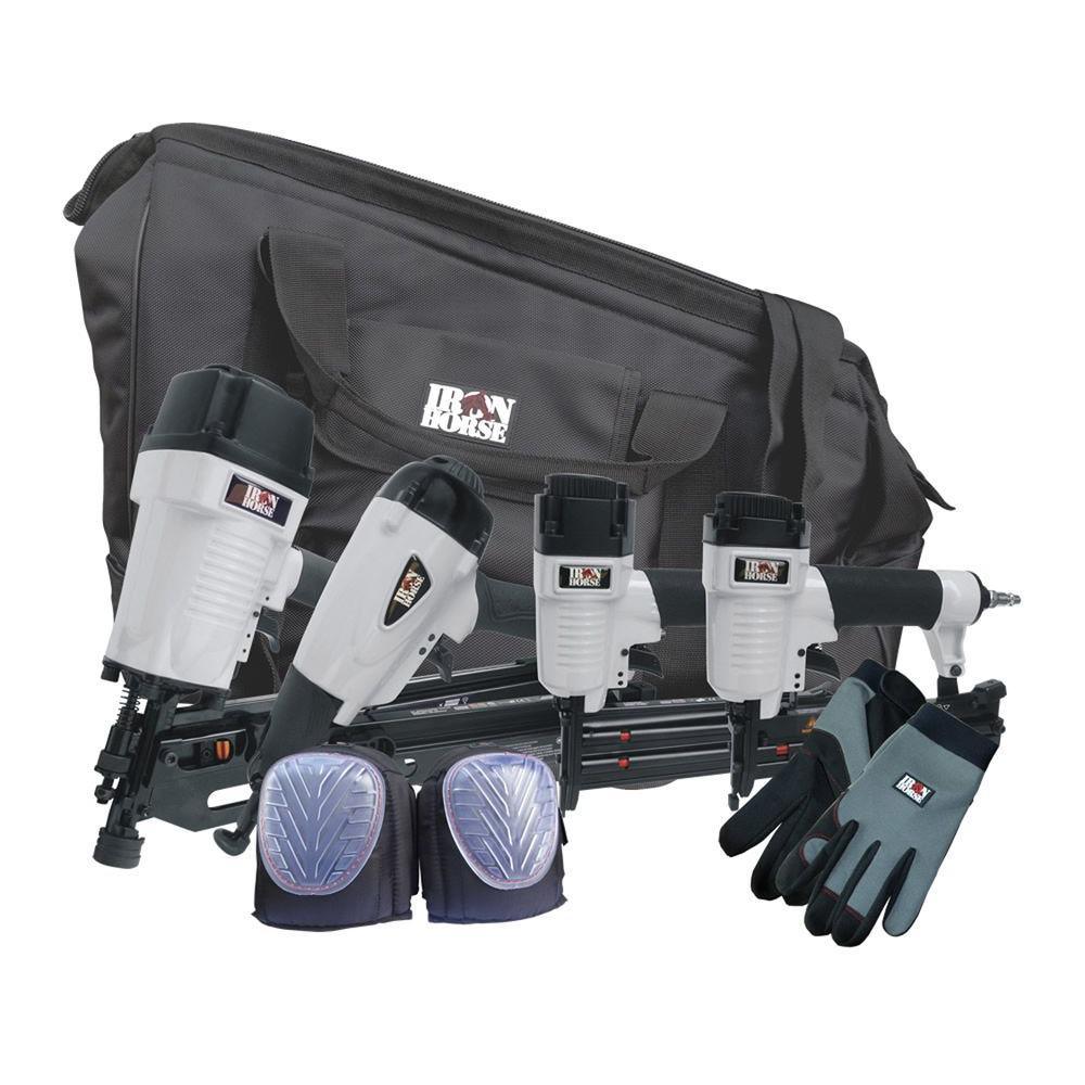The Iron Horse Pneumatic Nail Gun Combo kit includes four of our most popular guns. Included in the combo kit are the following models; IH-NS1: 2n1 1-1/4 in. Brad/Stapler, a IH-BN2: 2 in. 18-Gauge Brad Nailer, a IH-AFN34: 2 1/2 in. 16-Gauge, 34° Angle Finish Nailer and a IH-RHFN21: 3 1/2 in., 21° Round Head Framing Nailer. These guns provide the wides range of usage from installing moldings, baseboards, crown molding to framing jobs of all kinds. All the tools are carried in a heavy duty nylon tool bag. This bag protects and makes transportation of the tools and components easy.