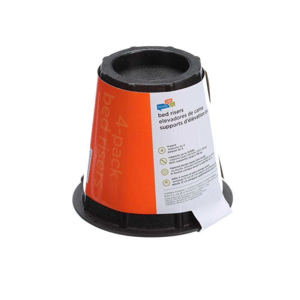 Honey-Can-Do STO-01004 6 in. Round Bed Risers, black. The set of 4 bed risers provides 5 in. of additional under-the-bed storage space. Fits posts up to 3 in. in diameter or width and boasts a 300 lbs. weight capacity for each riser. Perfect for dorm rooms, apartments, and kids rooms, where a little extra space can go a long way.