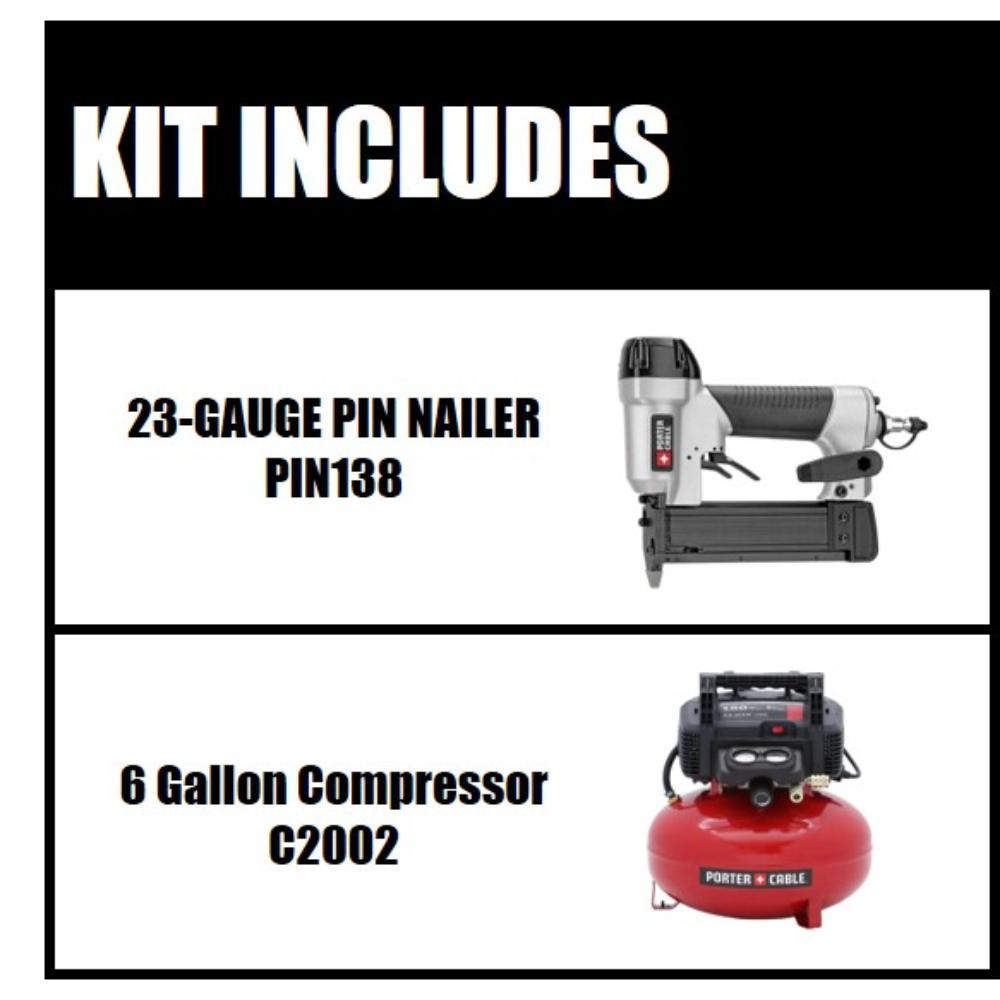The Porter-Cable Pin138 23-Gauge 1-3/8 in. Pin Nailer is ideal for materials that might split using larger tools or fasteners. It features an oil-free, low-maintenance design and a screwdriver handle that you'll appreciate when working in tight spaces. A handy light illuminates your work surface when needed. Typical uses include furniture assembly and installation of mini blinds or decorative shelving. This kit also includes the Porter-Cable C2002 150 PSI, 6 Gal. Oil-Free Pancake Compressor which is ideal for multiple trim finishing nailers, small framing/roofing jobs and all general inflation, blowing and smaller SCFM air tools. This compressor features a low Amp 120-Volt motor that starts easily in cold weather or with an extension cord. The C2002 is designed for portability with light weight (34 lbs.) and an integrated carry handle.
