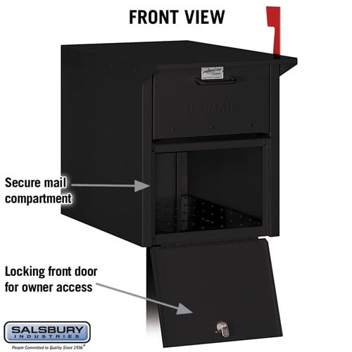 The Mail Chest - Black is a durable and secure mailbox designed for residential and commercial use. Made of aluminum with a powder-coated finish, it features locking doors, an outgoing mail tray, and a red signal flag for convenience.