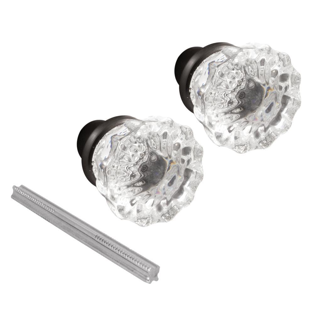 These are fluted clear glass knobs with diecast classic bronze bases with a 17/64 in. square spindle. Designed for interior door latch sets. Will fit square drive spindle systems common on old style or antique door hardware sets.
