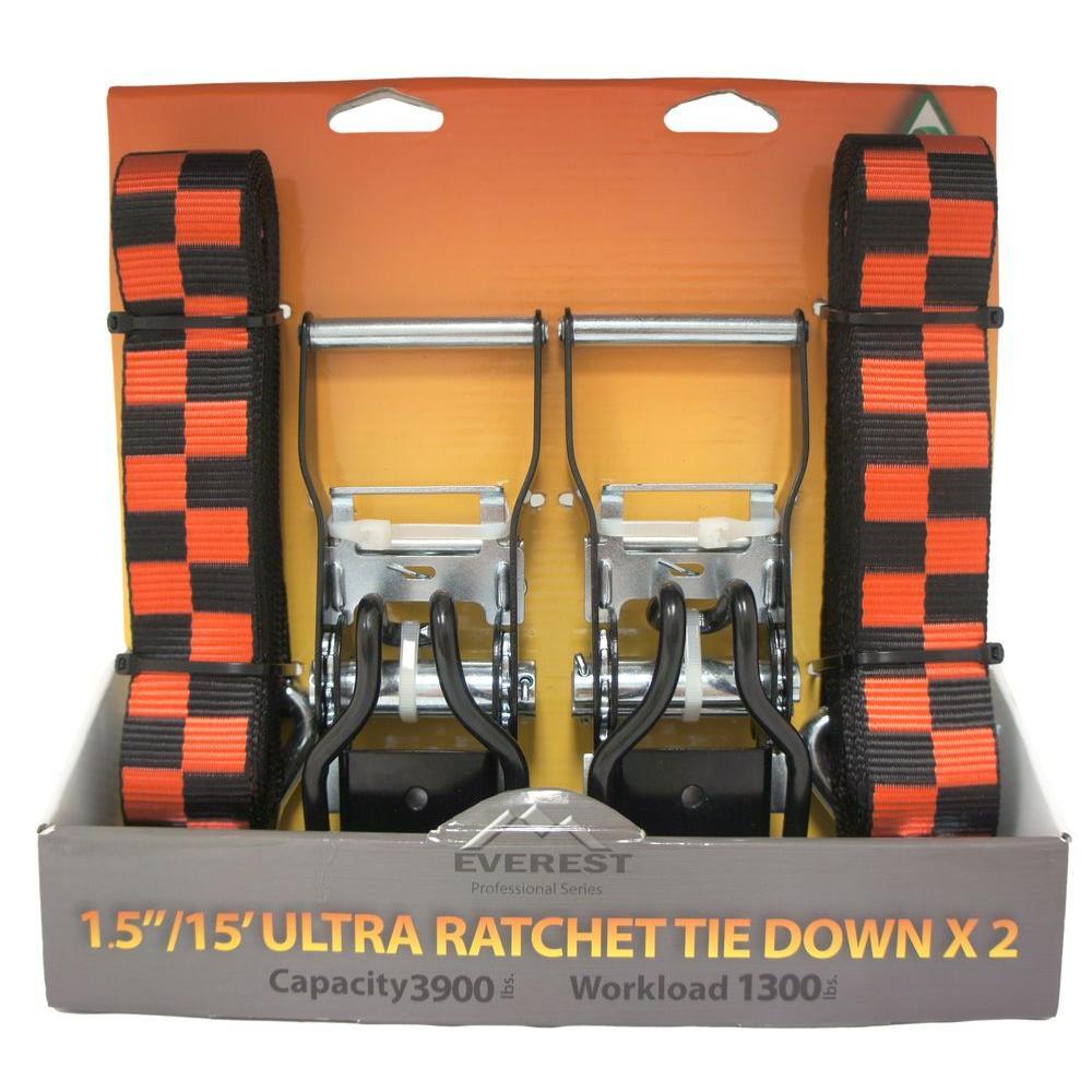 The EVEREST 1.5 in. x 15 ft. ratchet tie down strap (2-Pack) is designed for everyday use. This Extra heavy duty strap can be used for moving appliances and garden equipment, motorcycle tie down and trailer straps. The exclusive hook n tie design adds years to the life of this product. It comes with a commercial grade hardware body. Weather proof all-purpose handle and easy bar release add ease of use to your ratchet tie down. The 15 ft. of patented extra strong webbing gives you reliability when you most need it. With a 3900 lb. break strength and a 1300 lb. WLL (Working Load Limit). Racing, black and red checker board pattern.