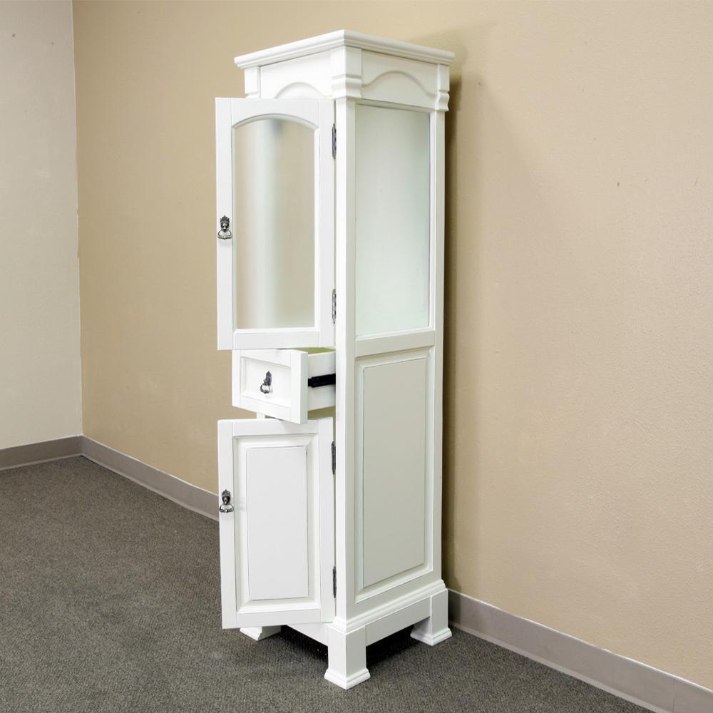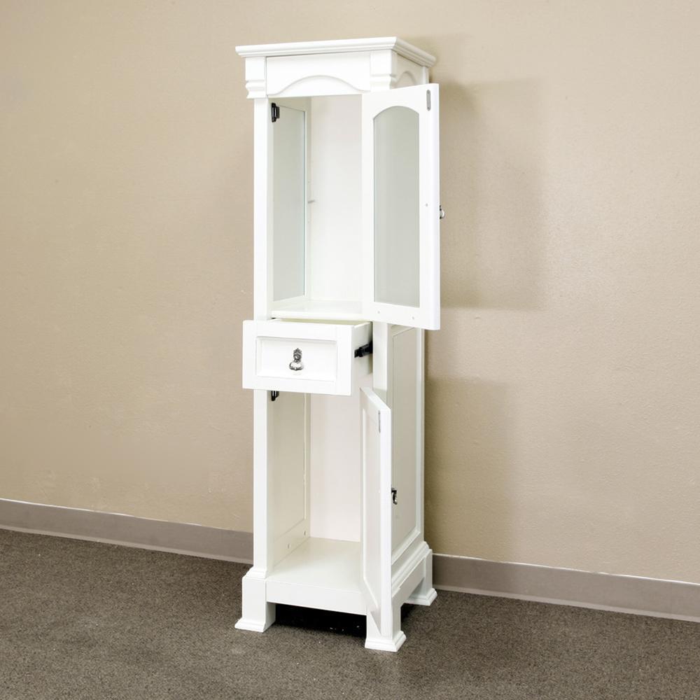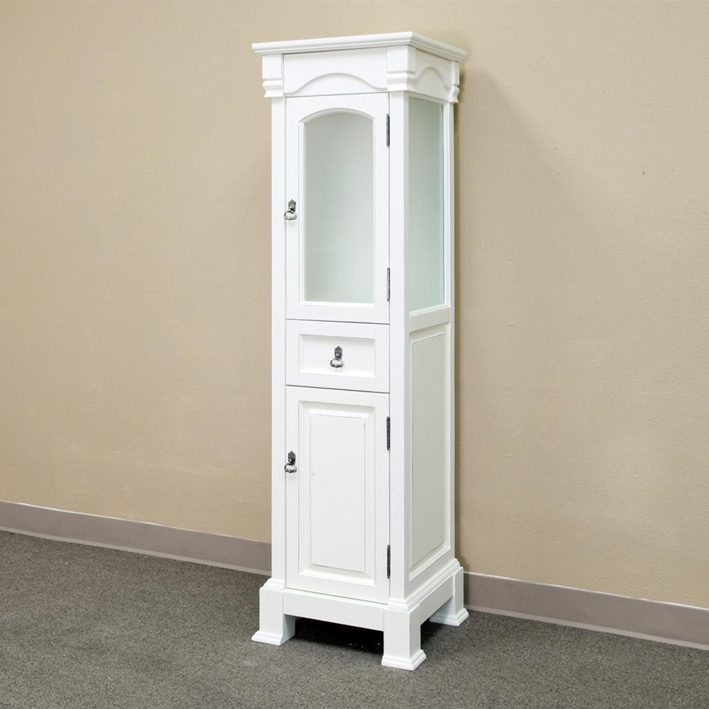 Cream white linen tower with the reminiscent of a swiss grandfather clock and crafted with the same meticulous attention to detail. This linen tower cabinet is an exquisite complement to a bathroom vanity. The clear glass of the upper door allows for subtle interior colors to show through creating a delightful tempering effect.