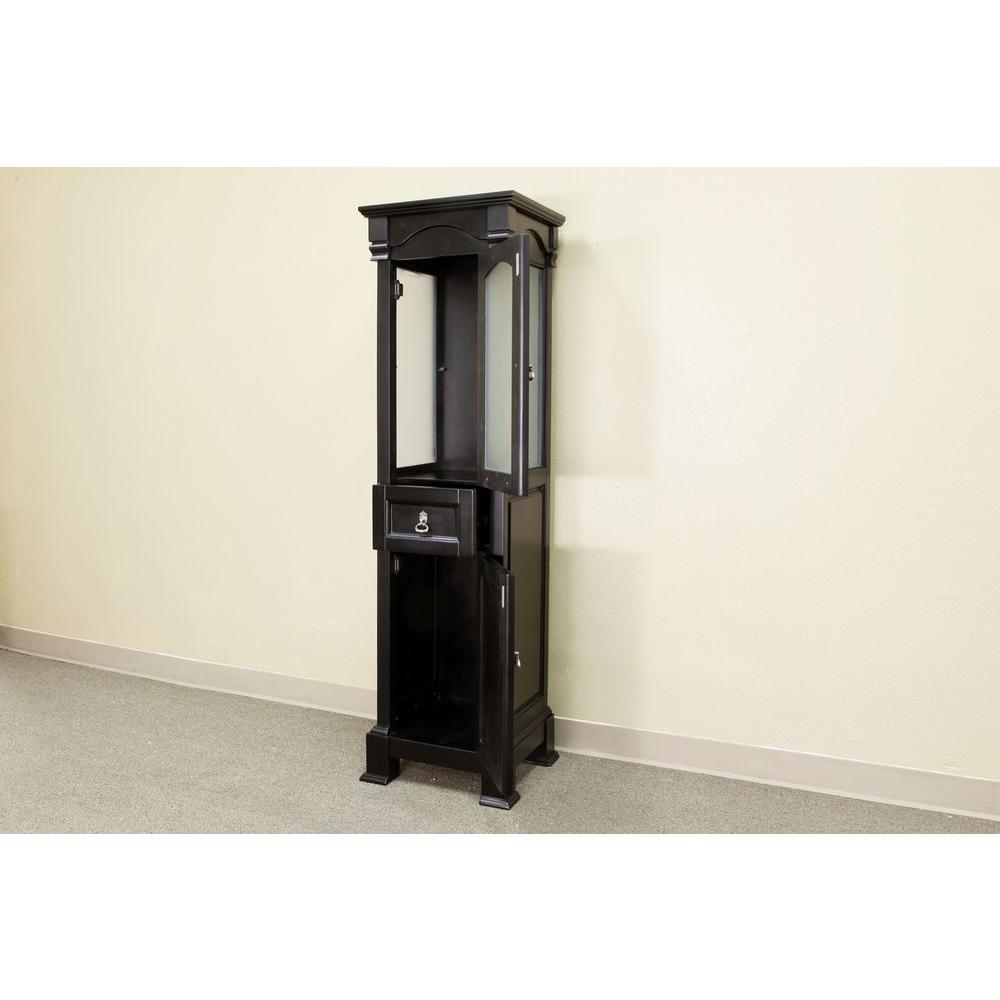 Espresso finish linen tower with the reminiscent of a swiss grandfather clock and crafted with the same meticulous attention to detail. This linen tower cabinet is an exquisite complement to a bathroom vanity. The clear glass of the upper door allows for subtle interior colors to show through creating a delightful tempering effect.