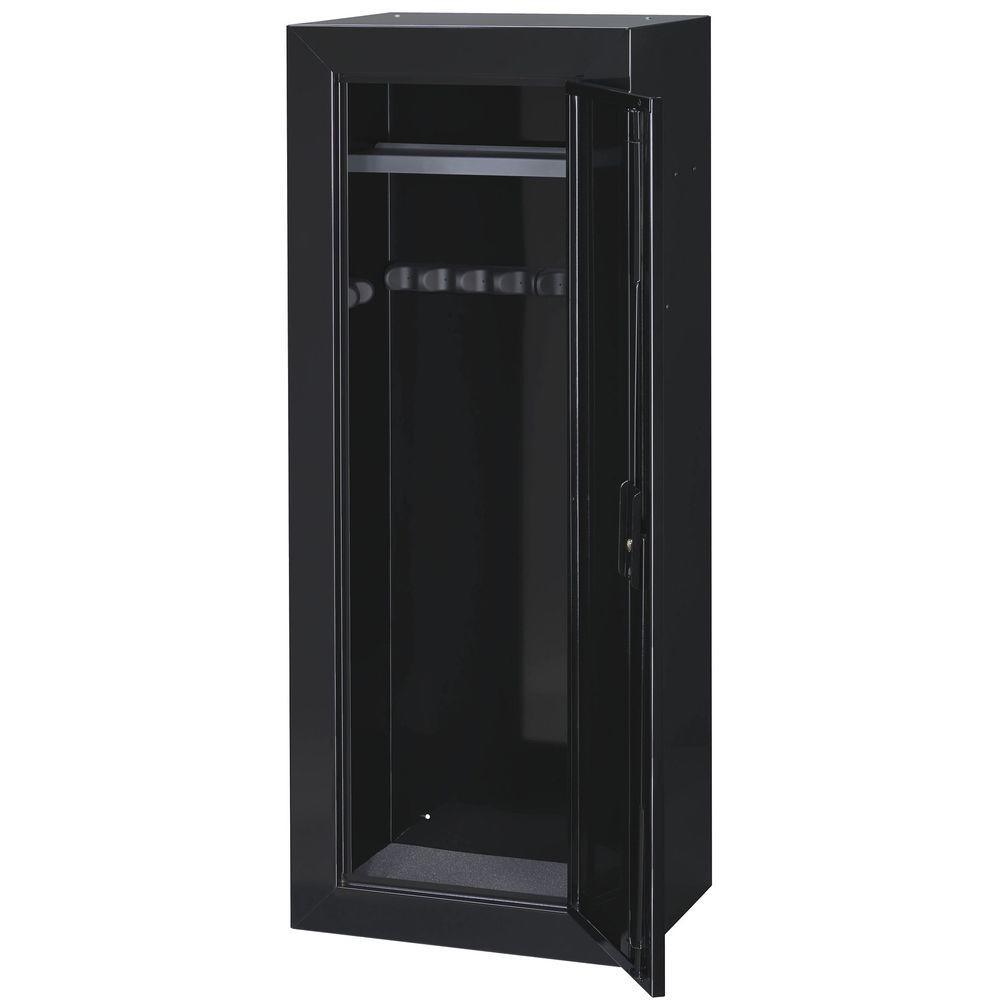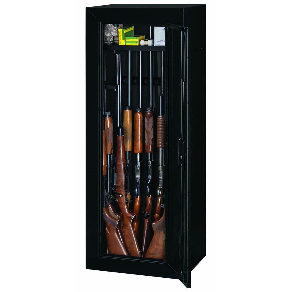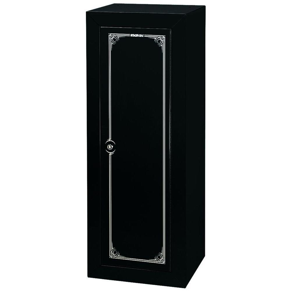 Stack-On's Steel Security Cabinet can hold up to 14 long guns and has been tested and verified to meet the California Department of Justice's standards as a fire arm safety device. Additional storage is available for storing ammo, handguns or other small items by utilizing the removable shelf which is included with the cabinet. This security cabinet has a high gloss black paint finish with chrome accents. This security cabinet offers the security, consumers-preferred features and price that has made Stack-On a value leader in steel security cabinets.