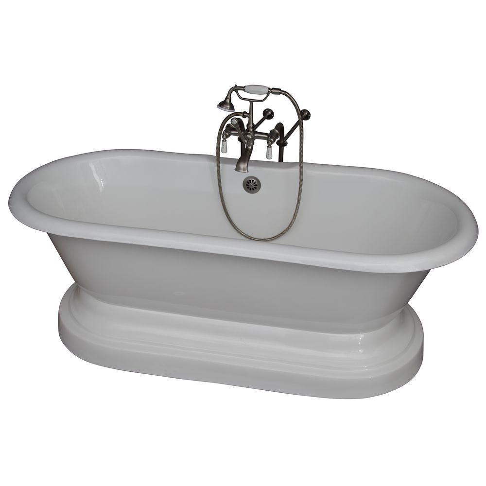 This striking cast iron double roll top tub rests on a decorative base. Elegant tub filler features elephant spout and hand shower. All necessary accessories are provided to install your tub to ensure a perfect bathing experience.