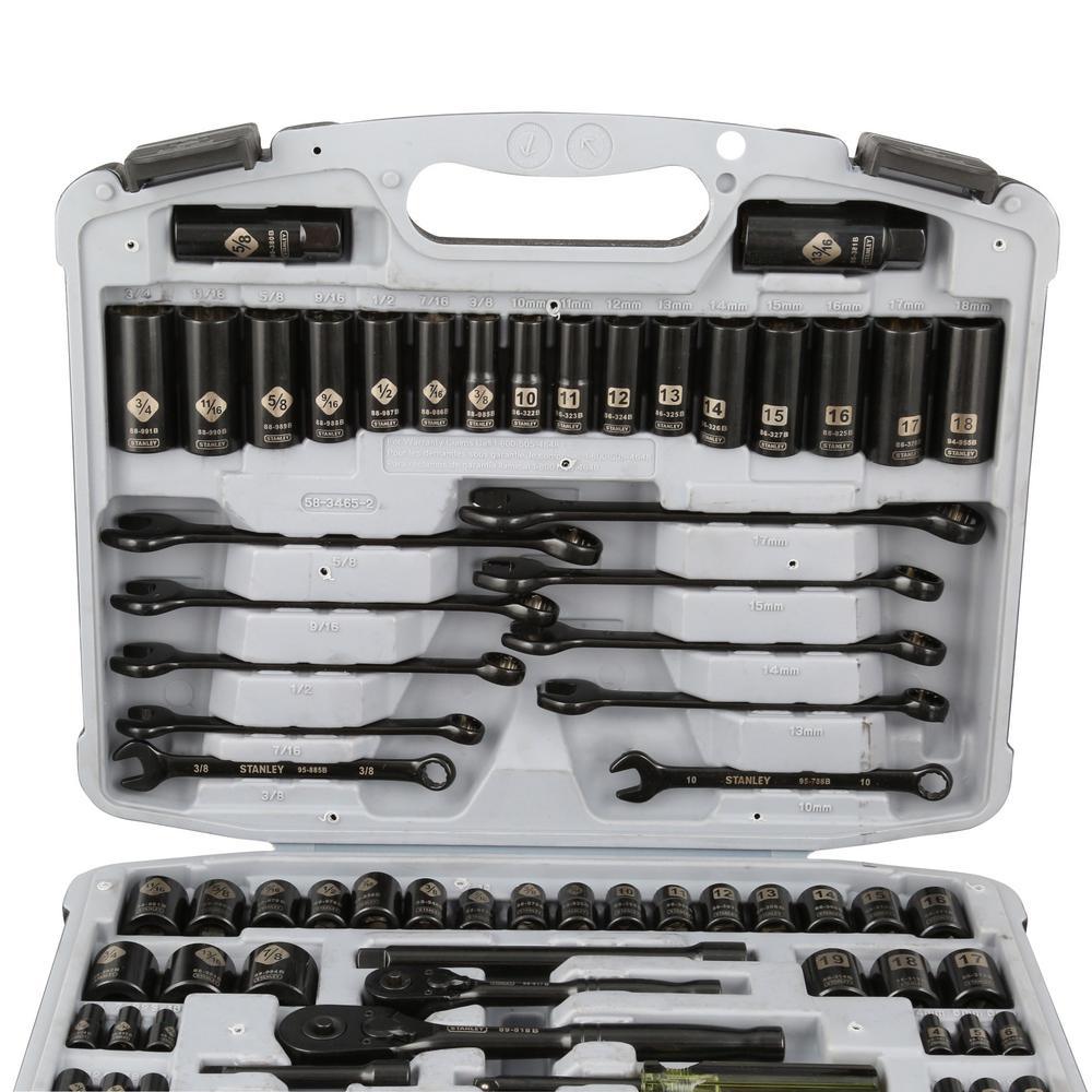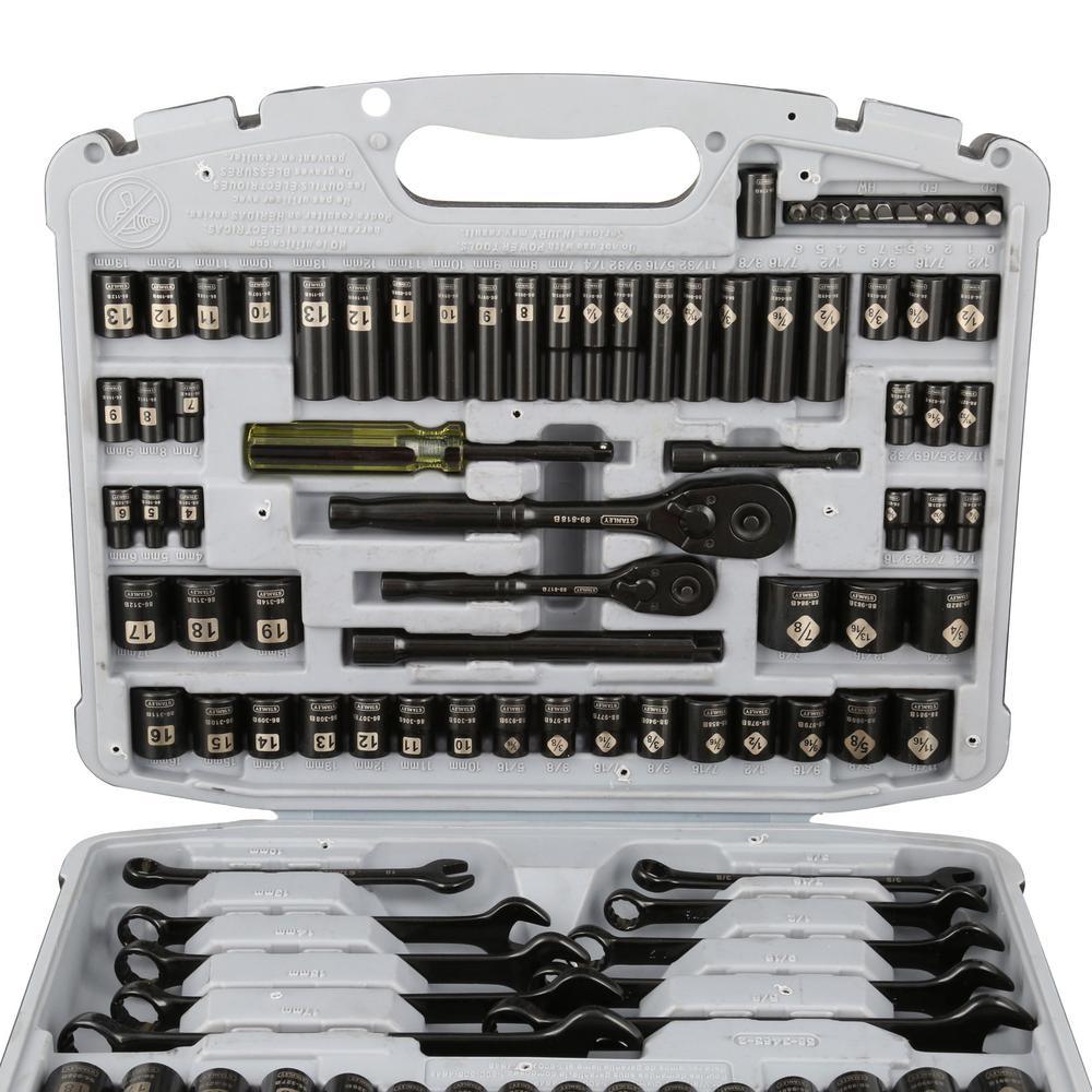 • Includes: (19) 1/4 in. drive 6 pt standard sockets, (19) 3/8 in. drive 6 pt standard sockets, (17) 3/8 in. drive 6 pt deep sockets, (14) 1/4 in. drive 6 pt deep sockets, (3) 3/8 in. drive 8 pt deep sockets, 3/8 in. drive 6 pt spark plug socket, 1/4 in. drive pear head ratchet, 3/8 in. drive pear head ratchet, 1/4 in. drive extension bar, 3/8 in. drive extension bar, 1/4 in. drive spinner handle, 10 combination wrenches (SAE and metric), 10 specialty bits, bit adapter and blow-molded carrying case