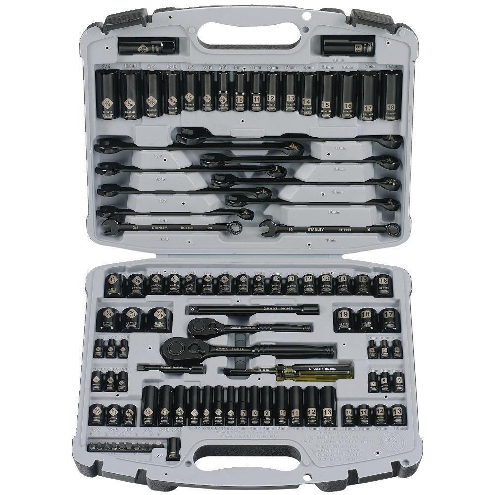 This comprehensive 99-piece socket set from Stanley contains a mix of SAE and metric sizes to complete a variety of fastening tasks. The components are constructed with high-strength chrome vanadium to tackle high-torque applications and are treated with a black chrome finish to inhibit corrosion. Sizable laser-etched markings are carved into the side of each socket for easy readability and wear resistance. Each device has a custom-fit storage slot in the included hard-sided carrying case, making portability and accessibility a cinch.