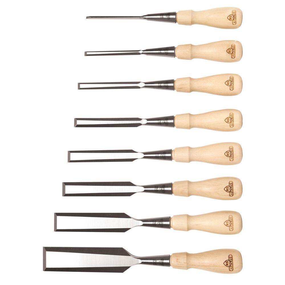 This chisel kit includes; 1/8 in., 1/4 in., 3/8 in., 1/2 in., 5/8 in., 3/4 in., 1 in. and 1-1/4 in. They are based off the classic 750 series design. The hornbeam wood handles are crafted for durability.