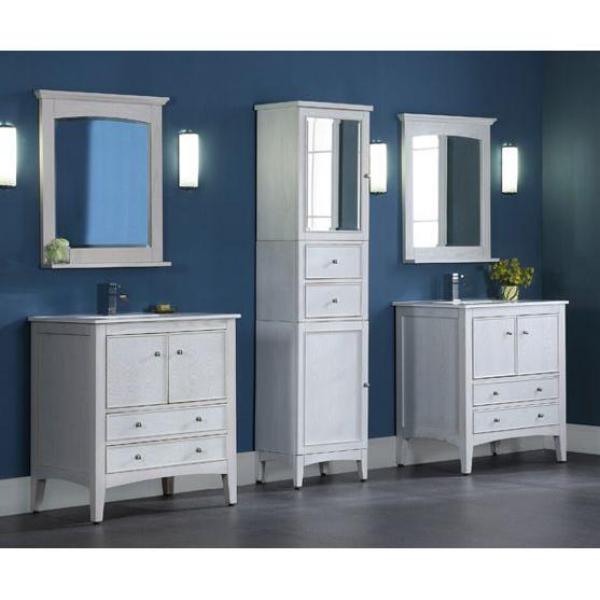 The Kent Tall Linen Tower in Whitewash features two cabinets and two drawers for organizing and storing your bathroom essentials. Its whitewash finish can accommodate almost any decorating scheme, and its brushed nickel hardware gives it an elegant appearance. The ash construction with ash veneers ensures long-lasting use and enjoyment as well as giving the cabinet a distinctive character with its pronounced ash grain pattern.Mirror sold separately