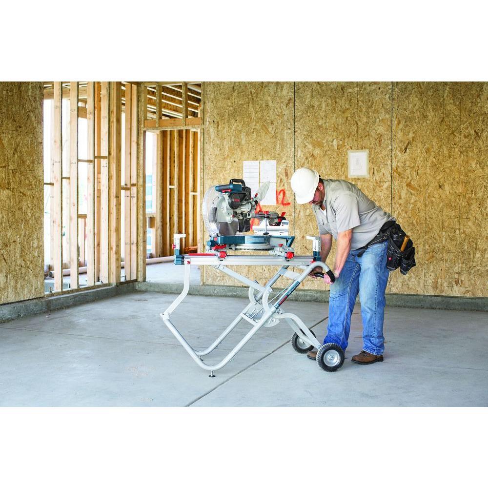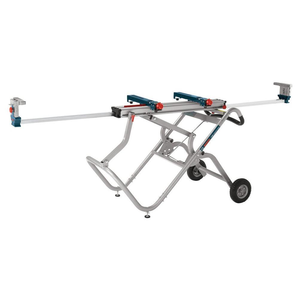 The Bosch T4B gravity-rise miter saw stand features the patented gravity rise system and rapid set up and breakdown. It has an 18 in. material capacity which is the highest capacity among fully portable units. It has 8 in. pneumatic wheels which facilitate ease of transport over jobsite terrain. The stand also features rapid release tool mounts, adjustable leveling feet for stability on uneven surfaces and it also fits most competitors' miter saws. Bosch bench top tools provide the precision and performance your projects require. Durable quality is not only in every tool, but the trust you have in Bosch bench top tools.
