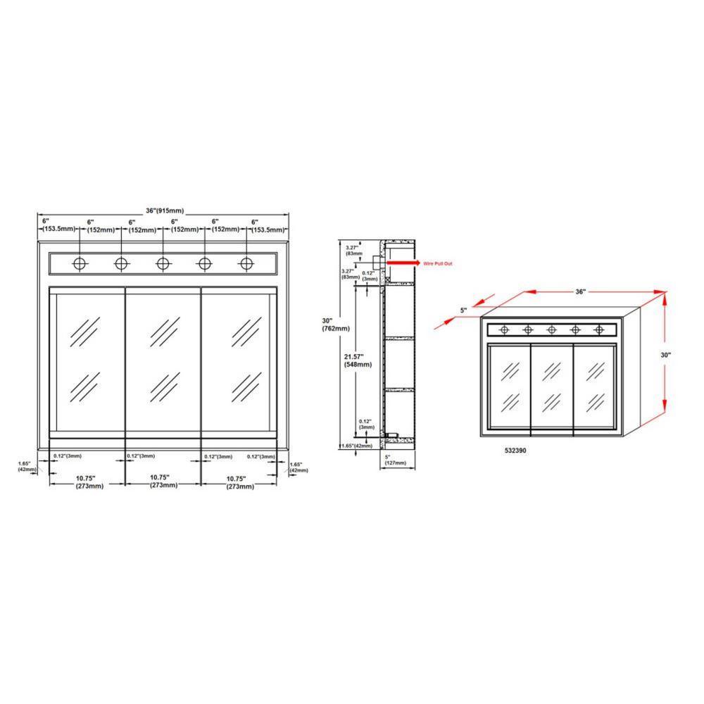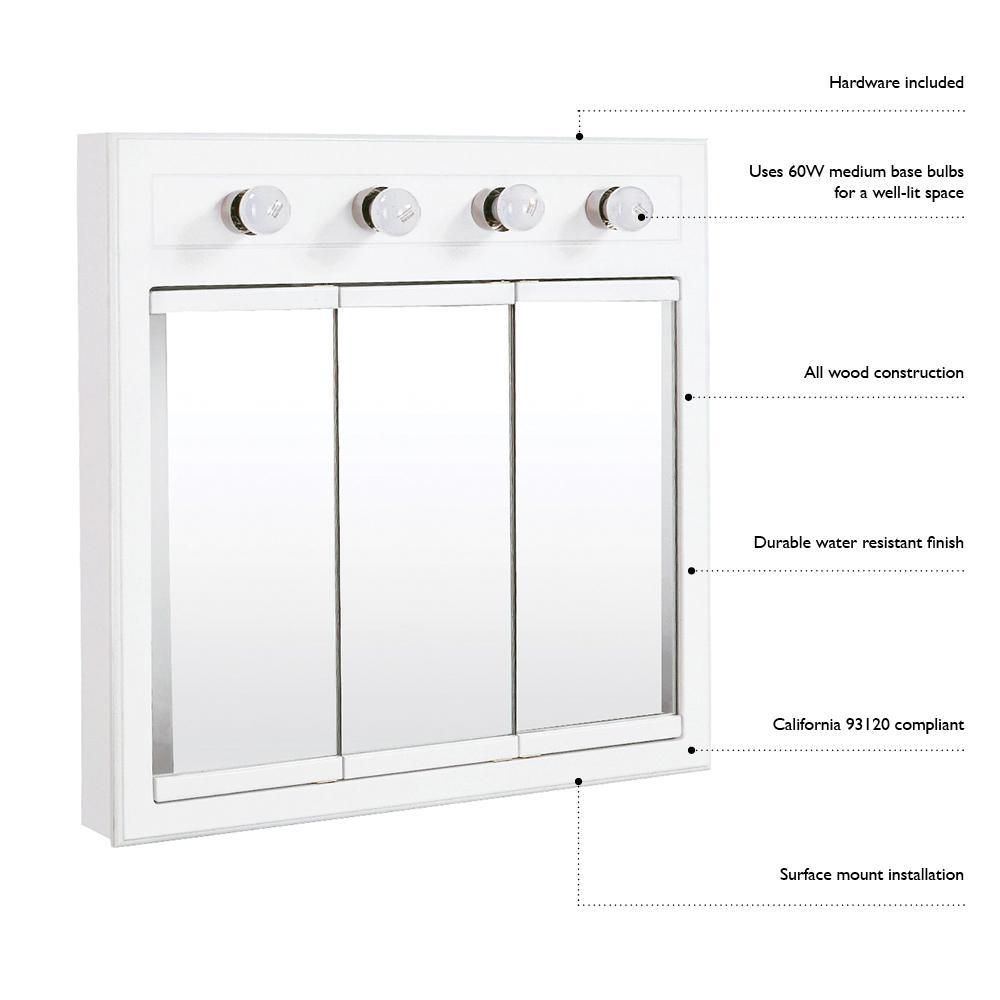 • 36 in. W x 30 in. H 5-light tri-view medicine cabinet provides ample storage space
