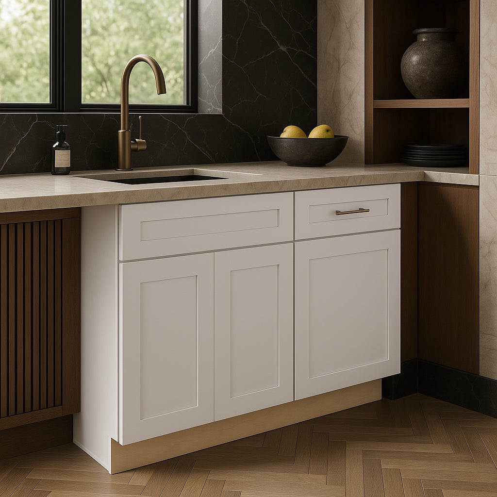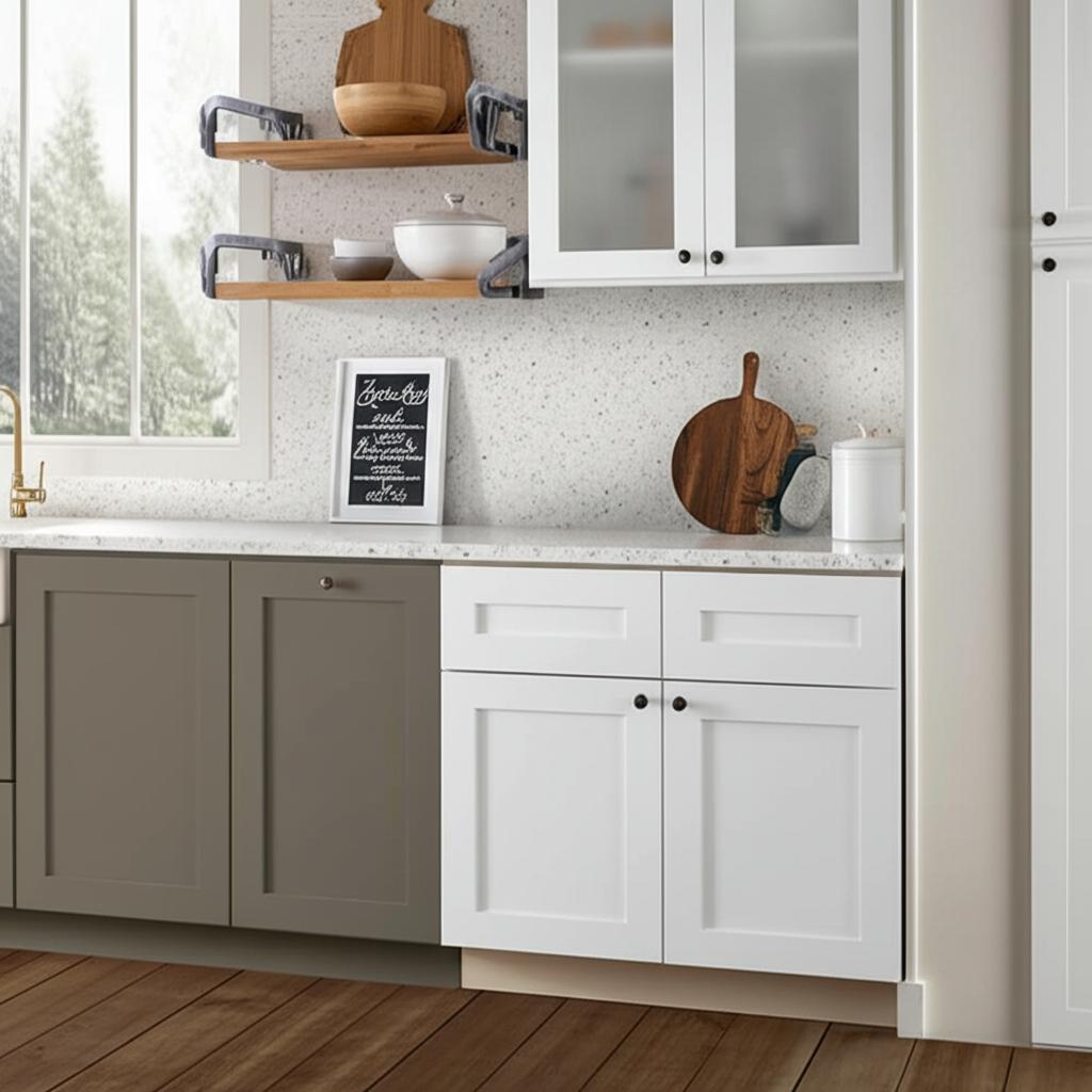 • Elegant Design: Features shaker-style doors with 3-inch wide frames and flat recessed center panels.