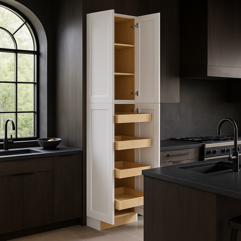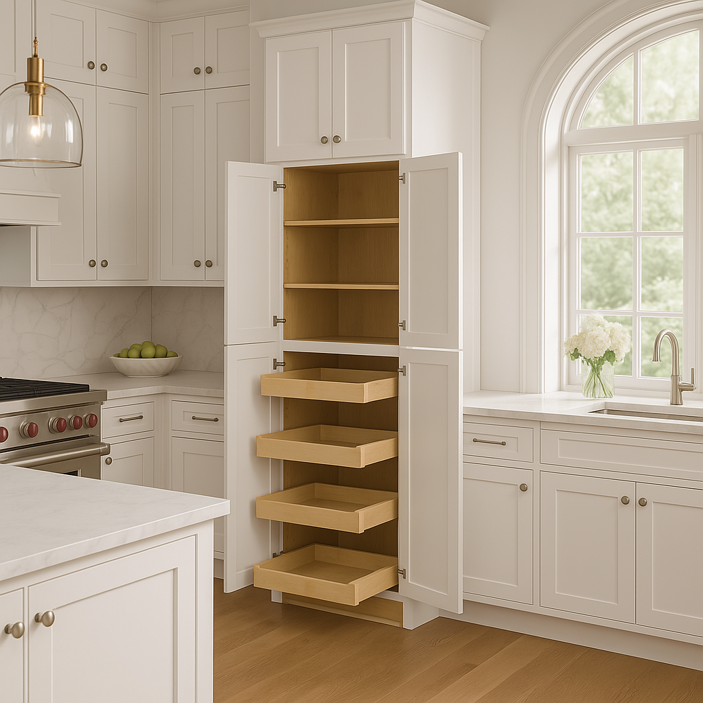 The Newport Pacific White pantry cabinet combines elegant shaker-style design with durable plywood construction. Featuring adjustable shelves and soft-close doors, it offers both style and functionality for modern kitchens.