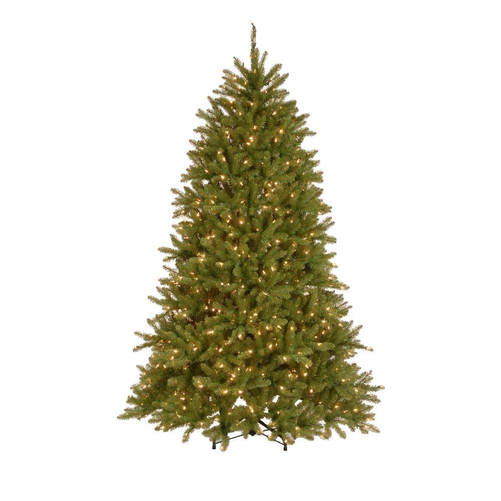 Get ready for the holiday with this 12-ft. Dunhill fir artificial Christmas tree. Pre-lit with 1,500 clear incandescent lights, this tree makes a dazzling display in your gathering place. It features 7,794 branch tips to produce a robust, life-like appearance while leaving ample space to decorate with your favorite Christmas ornaments. The fire-resistant tree is easy to assemble and features hinged construction for stability. It includes spare bulbs, a metal stand and a 6-ft. cord that plugs into standard outlets.