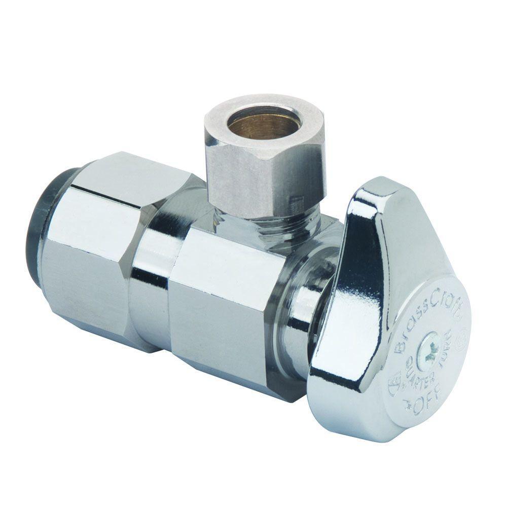The 90 degree handle design on the BrassCraft 1/2 in. Nominal Push Connect Inlet x 3/8 in. O.D. Compression Outlet 1/4-Turn Angle Valve allows you to stop the water flow leading to a plumbing fixture without disrupting the entire house flow. The Push Connect valve feature makes installation easy requiring no special tools, soldering or glue for a watertight seal. This angle valve is best used where the water pipe enters the room from the floor and on faucets, toilets, dishwashers, icemakers or washing machines.