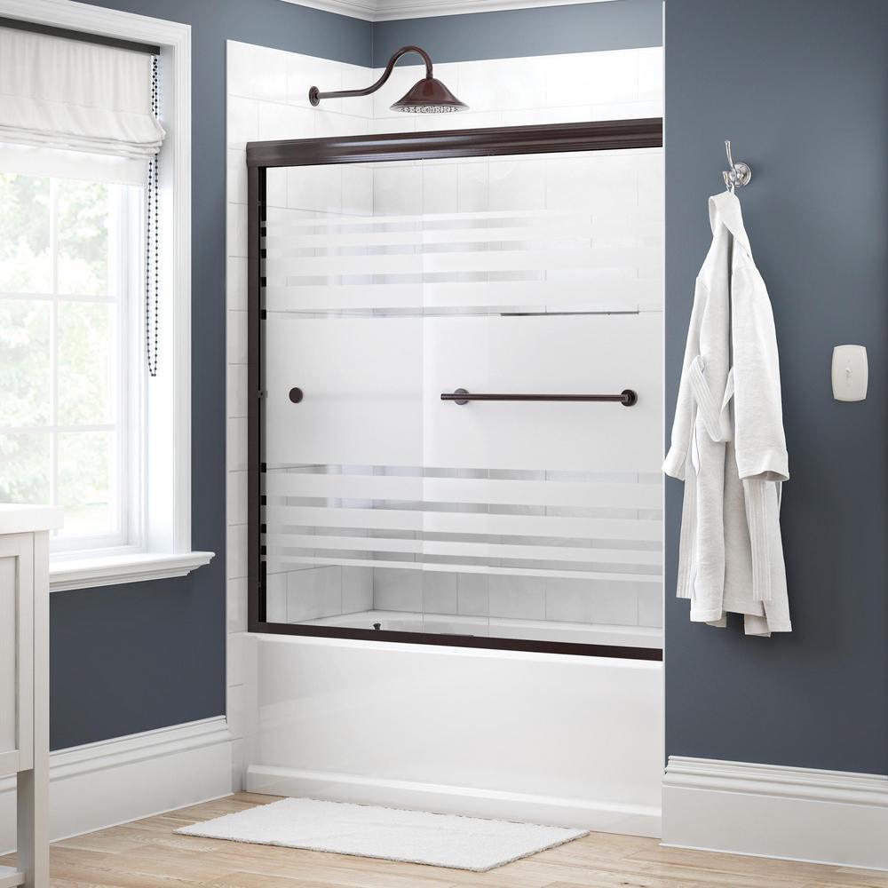 Traditional sliding bathtub door designed to accommodate out-of-plumb (uneven, not vertically level) conditions totaling 3/8 in.