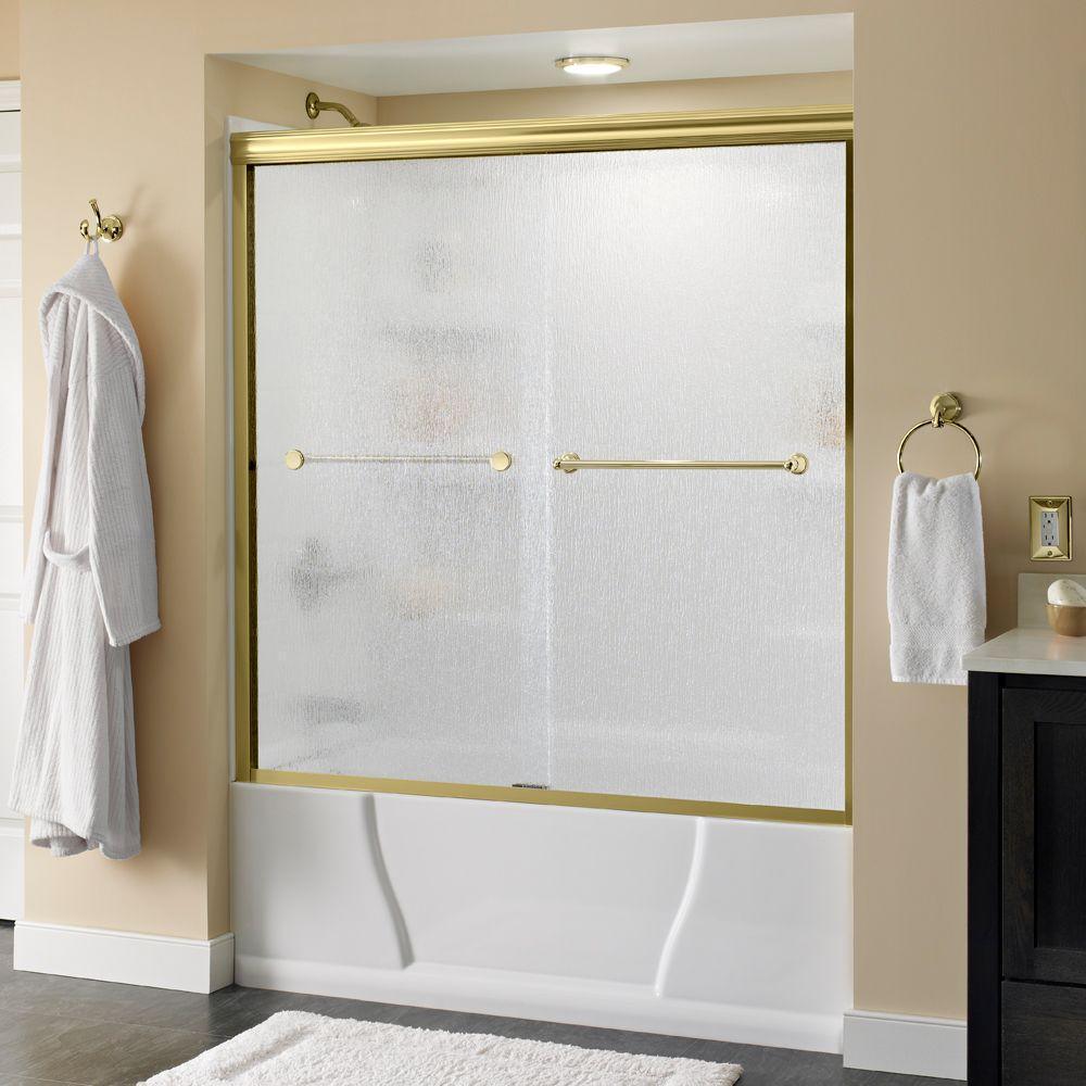 Traditional sliding bathtub door designed to accommodate out-of-plumb (uneven, not vertically level) conditions totaling 3/8 in.