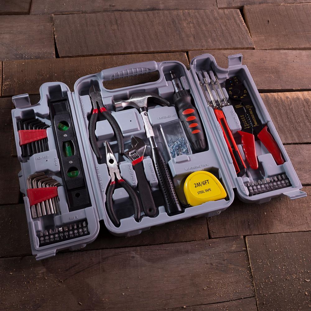 130-Piece Tool Set by Stalwart comes with all the household essential tools you would need for almost all minor maintenance. Stalwart tools are made from durable metal construction giving you ultimate precision. This well-organized kit comes in a compact durable plastic carrying case that fits anywhere in your home, apartment, garage or even the car. Great for DIY projects or every day home improvements.