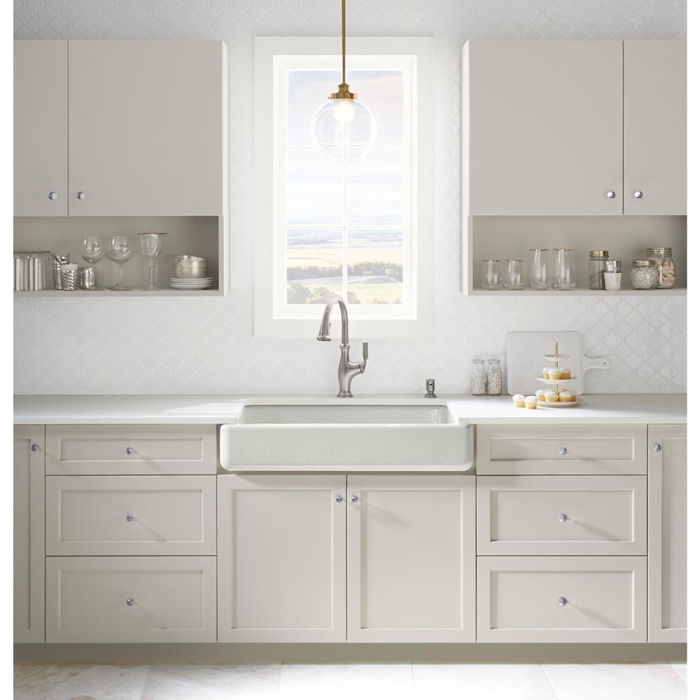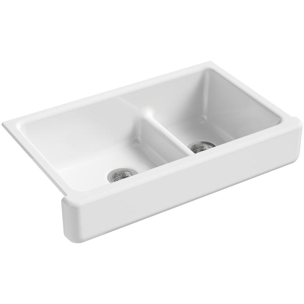 The Whitehaven apron-front kitchen sink features a streamlined and versatile farmhouse style to complement any decor. Perfect for remodeling projects, it has a shortened apron that allows for installation on most new or existing 36 in. standard cabinetry. The Self-Trimming design requires only a simple rough cut, overlapping the cabinet face for beautiful results and easy installation. A low barrier divides the two compartments, making it easy to wash and rinse large items while still keeping the two basins separate. Crafted from enameled cast-iron, this sink resists scratching, burning and staining for years of beauty and reliable performance.