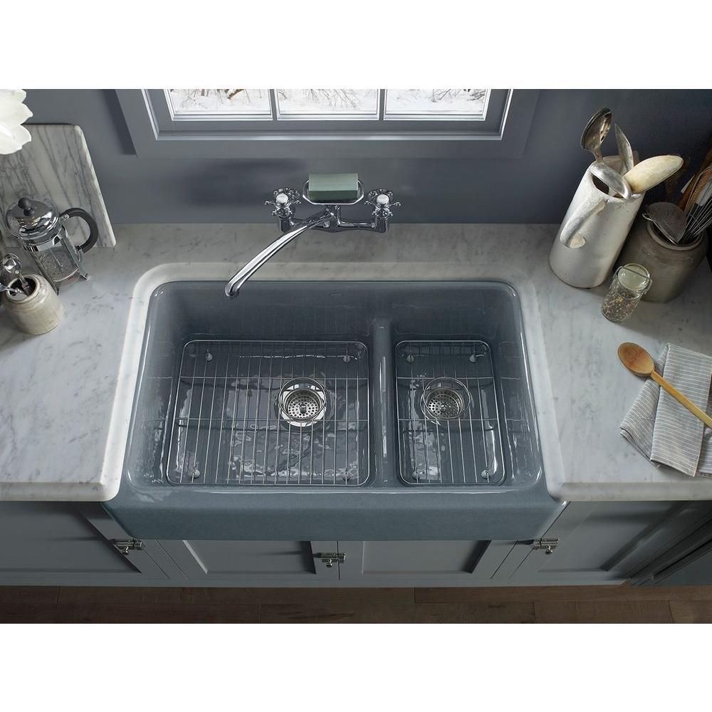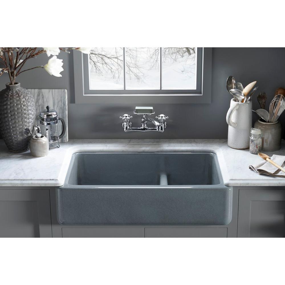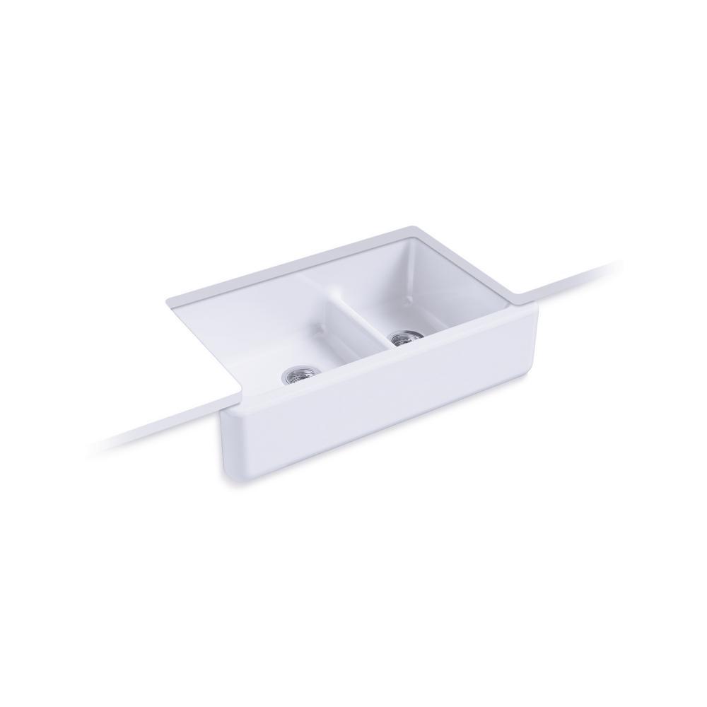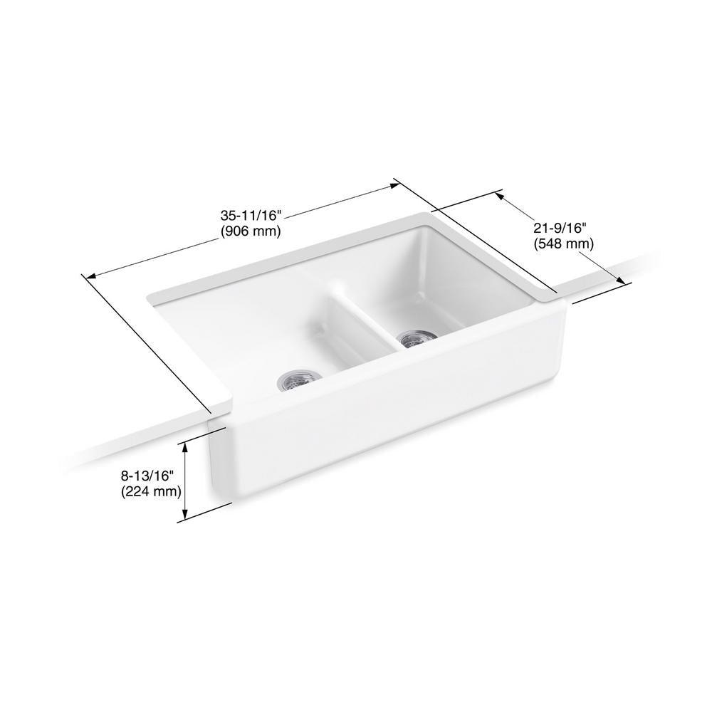 The Whitehaven apron-front kitchen sink features a streamlined and versatile farmhouse style to complement any decor. The Self-Trimming design requires only a simple rough cut, overlapping the cabinet face for beautiful results. The sink is designed to fit in most standard 36 in. apron-front cabinetry. A low barrier divides the two compartments, making it easy to wash and rinse large items while still keeping the two basins separate. Crafted from enameled cast iron, this sink resists scratching, burning and staining for years of beauty and reliable performance.