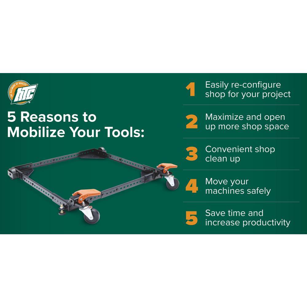 With the HTC-2000 Universal Mobile Base, stability and mobility are longer an issue for (once) stationery power tools on the shop floor. Swivel casters on 2 corners ensure excellent maneuverability. Featuring side rails and heavy gauge corner brackets that increase overall machine height less than an inch. Fully adjustable in 1 in. increments to insure the perfect fit to your machine.