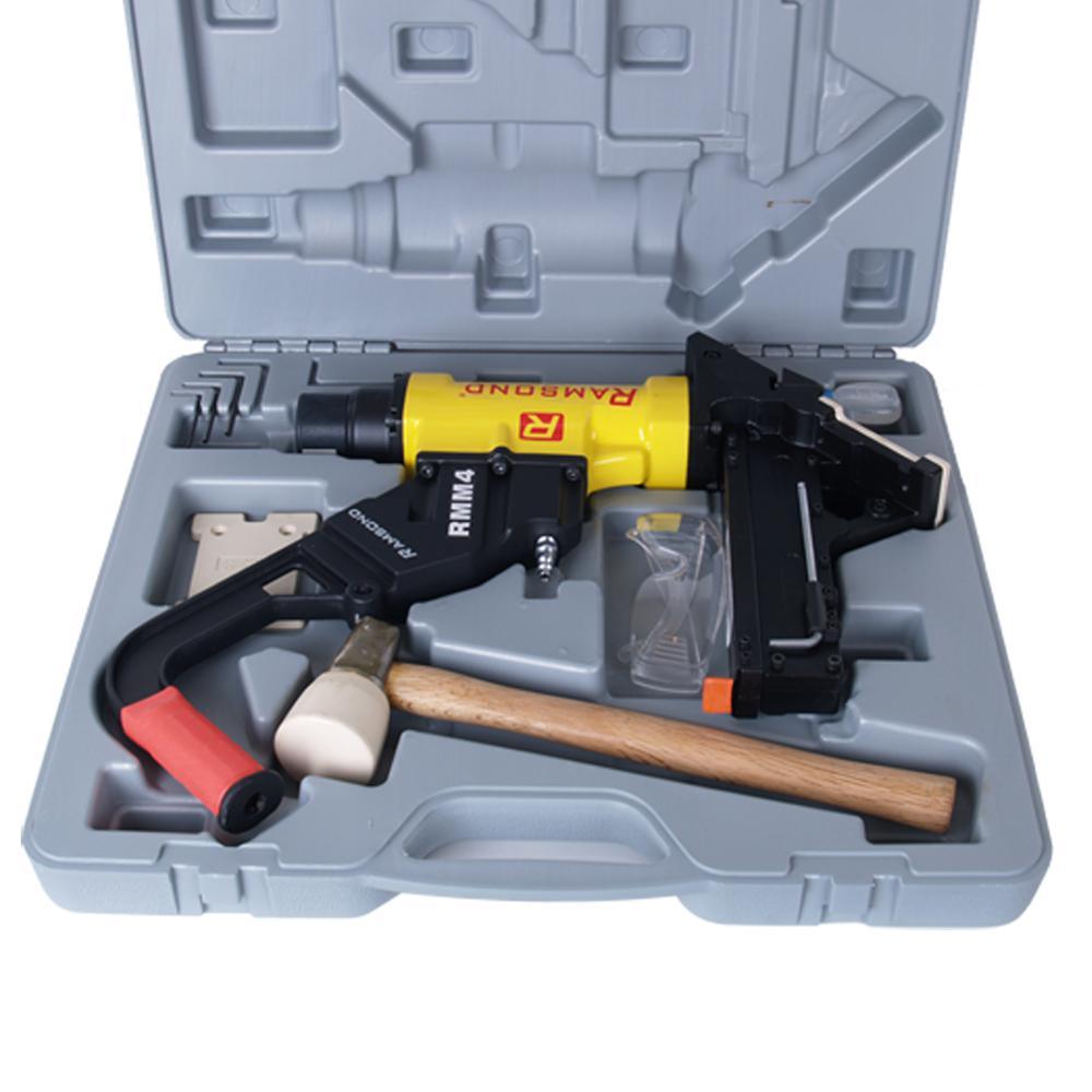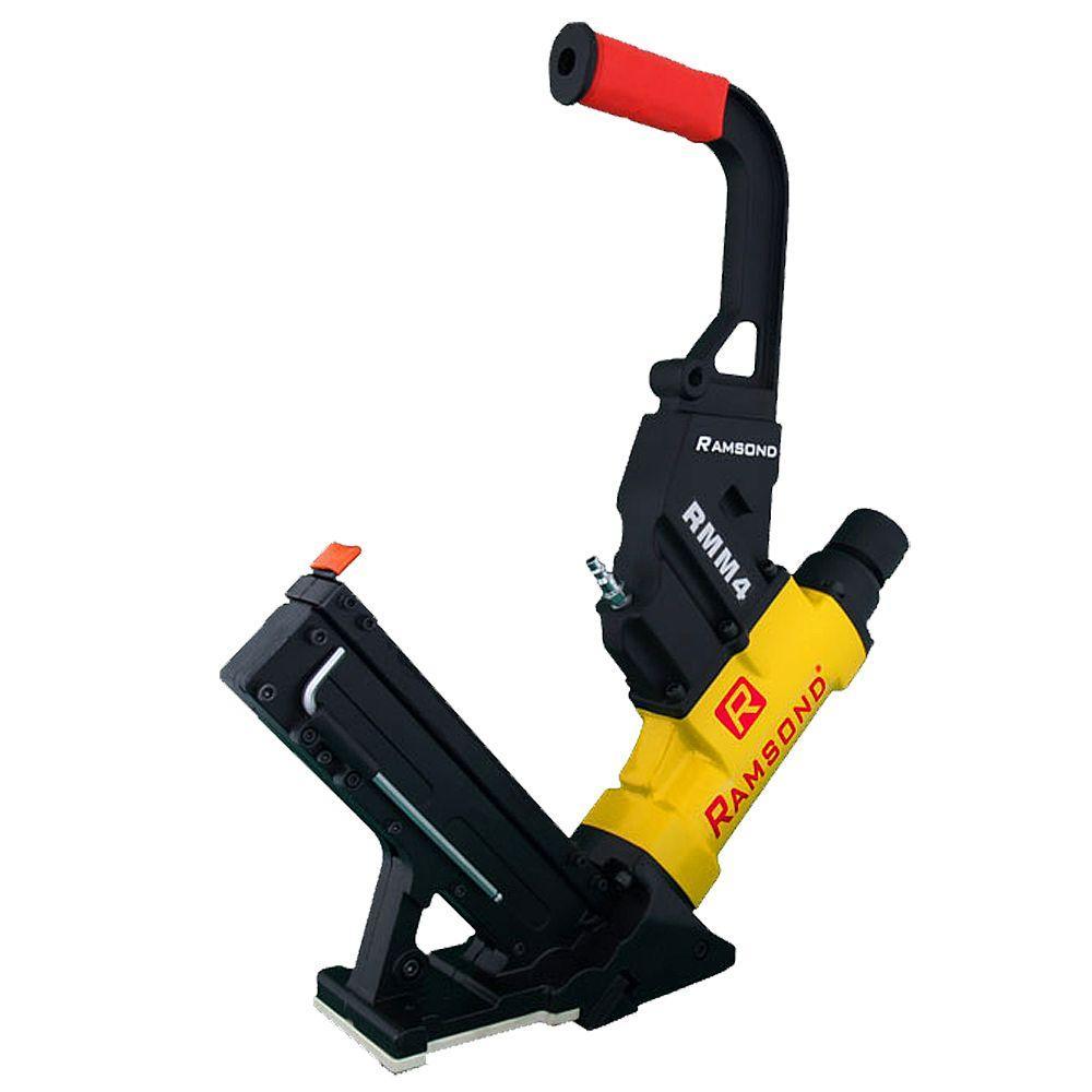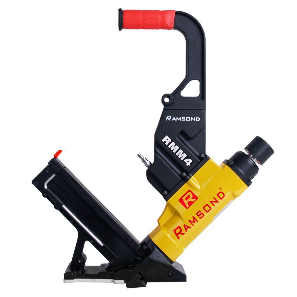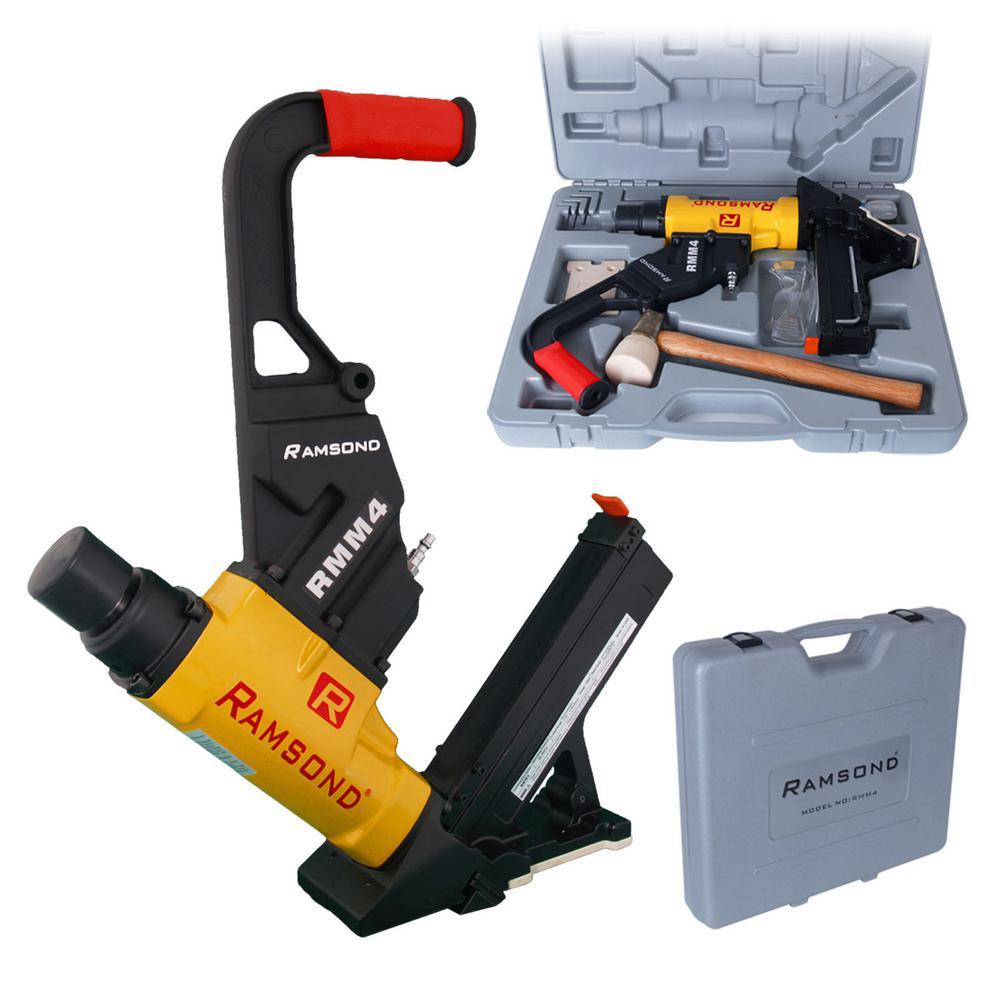 The Ramsond RMM4 2-in-1 Hardwood Flooring Cleat Nailer and Stapler is one of America's best-selling hand tools, with thousands of units sold. Engineered for versatility, strength and durability, the air-powered RMM4 is capable of firing both cleat nails and staples (15.5 and 16-Gauge staples from 1 to 2 in., "L" cleat from 1-1/2 in. to 2 in.) it holds a maximum capacity of 100 staples or cleats. It remains light and agile while still being highly durable and maintaining contractor/industrial quality. The body of the RMM4 is constructed of durable die-cast alloy for job site strength with low weight. It comes with several extra-wide composite non-marring base plates for added stability and protection against scratches to the flooring surface. The plates are designed to allow the user to drive fasteners much faster and closer to the wall, while giving added protection to the flooring material itself. The RMM4 also has a conveniently long reach handle with an ultra-padded cushioned grip providing balance, optimal comfort, stability and safety. The internal driver blade is constructed of very tough heat treated, hardened steel. This ergonomically designed multifunctional tool is manufactured under the strict ISO guidelines for quality control. The Ramsond RMM4 - The entire tool you need for any flooring job.