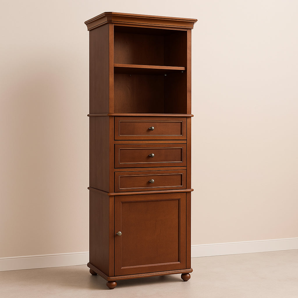 Transform your bathroom or living space with the Hampton Harbor Corner Linen Cabinet. Its rich sequoia finish and classic design elements, such as crown molding and bun feet, bring a touch of timeless elegance to any room. Use it to store linens, accessories, or decorative items, making it both functional and stylish. This cabinet is a must-have for creating a cozy yet sophisticated ambiance.