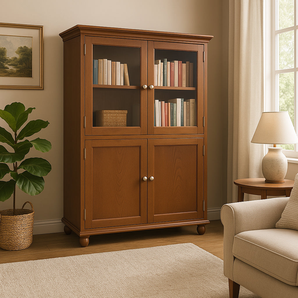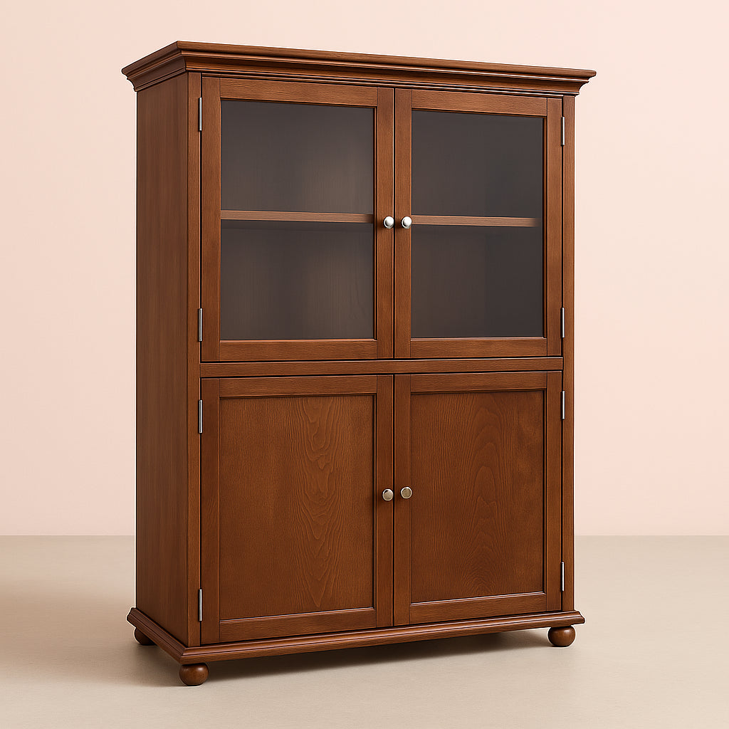 The Hampton Harbor Linen Cabinet in Sequoia combines timeless design with practical storage. Featuring a solid wood frame, adjustable shelves, and elegant glass-paneled doors, this cabinet is perfect for organizing linens or showcasing decorative items.